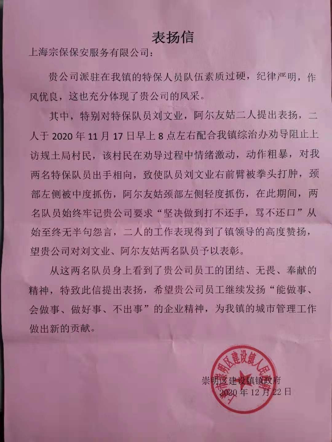 12月22日,宗保公司駐崇明區(qū)建設(shè)鎮(zhèn)城管輔助項(xiàng)目收到建設(shè)鎮(zhèn)政府送來的一封表揚(yáng)信,信中對劉文業(yè)、阿爾友姑的優(yōu)秀表現(xiàn)提出特別表揚(yáng)。
