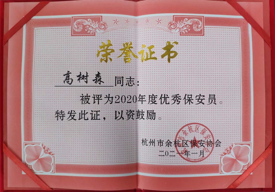 浙江民泰公司被評(píng)為2020年度優(yōu)秀保安服務(wù)公司,保安員楊有福、高樹森被評(píng)為2020年度優(yōu)秀保安員,布超杰被評(píng)為余杭區(qū)治保先進(jìn)個(gè)人。