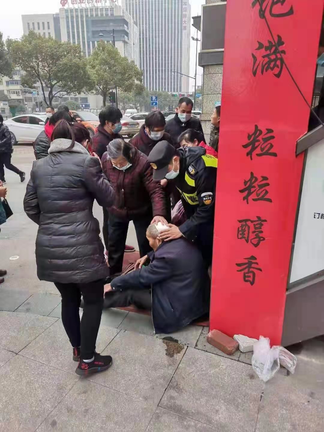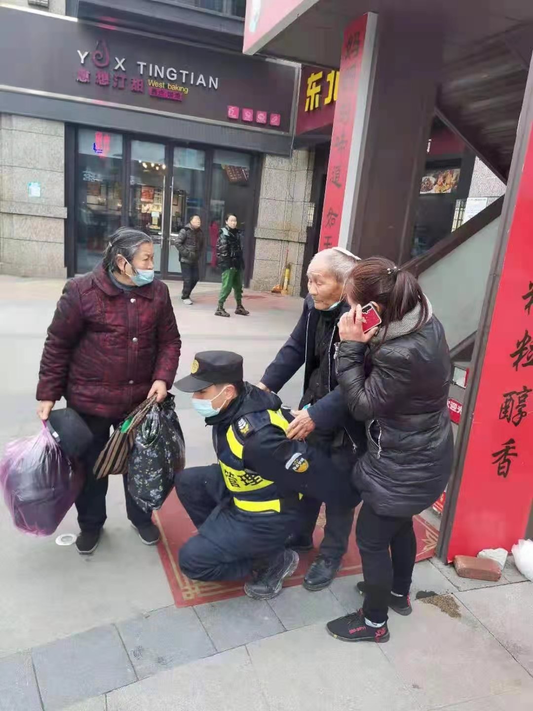1月24日,浙江民泰駐東湖市容項目隊員張艮振幫助摔傷大伯。