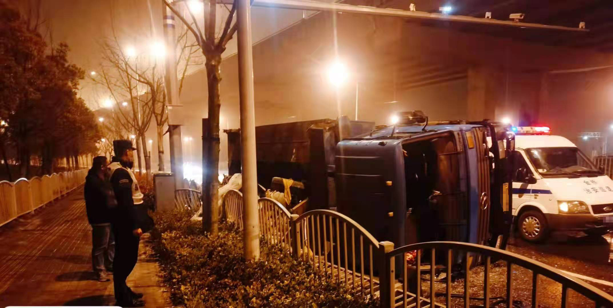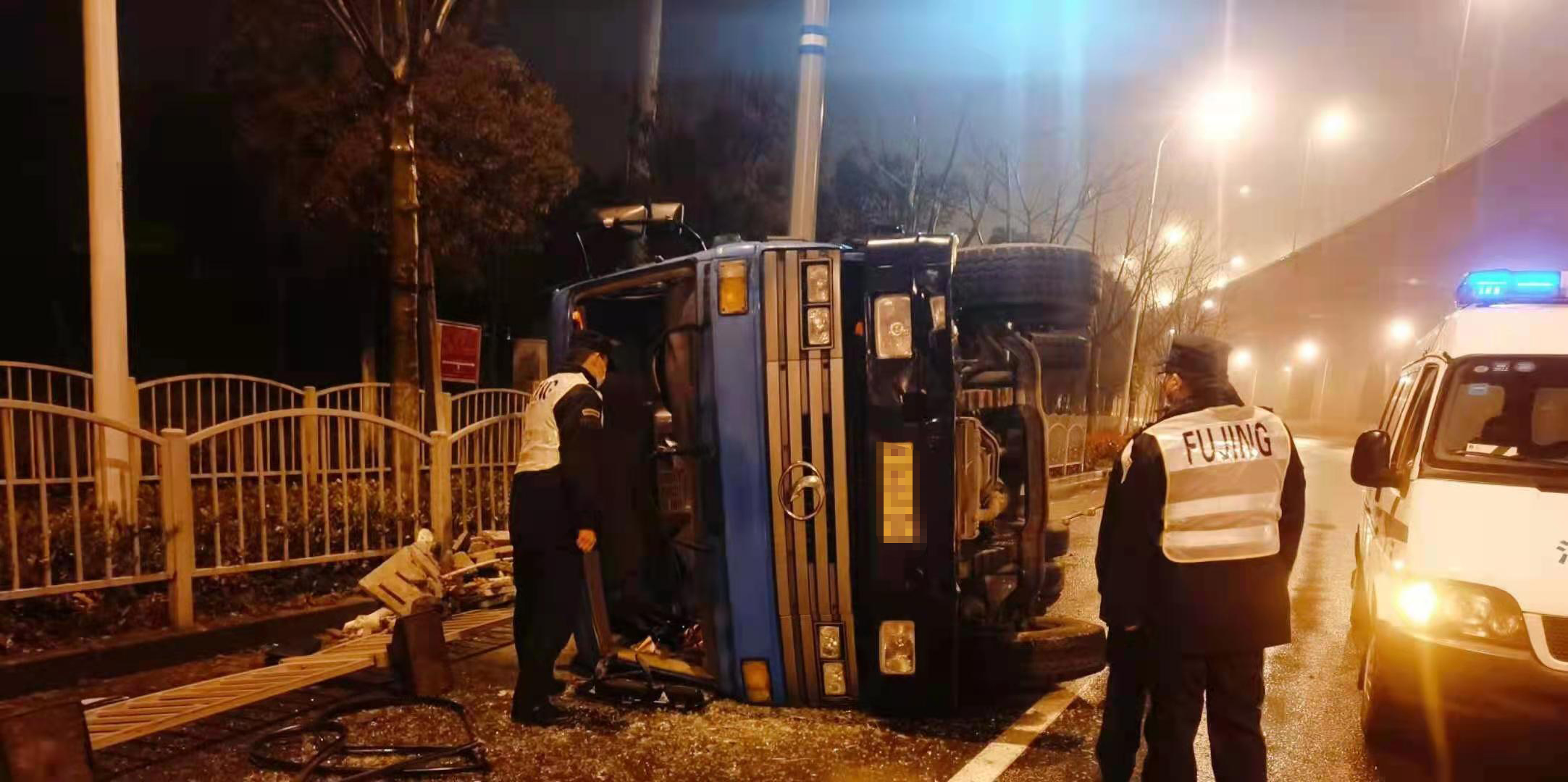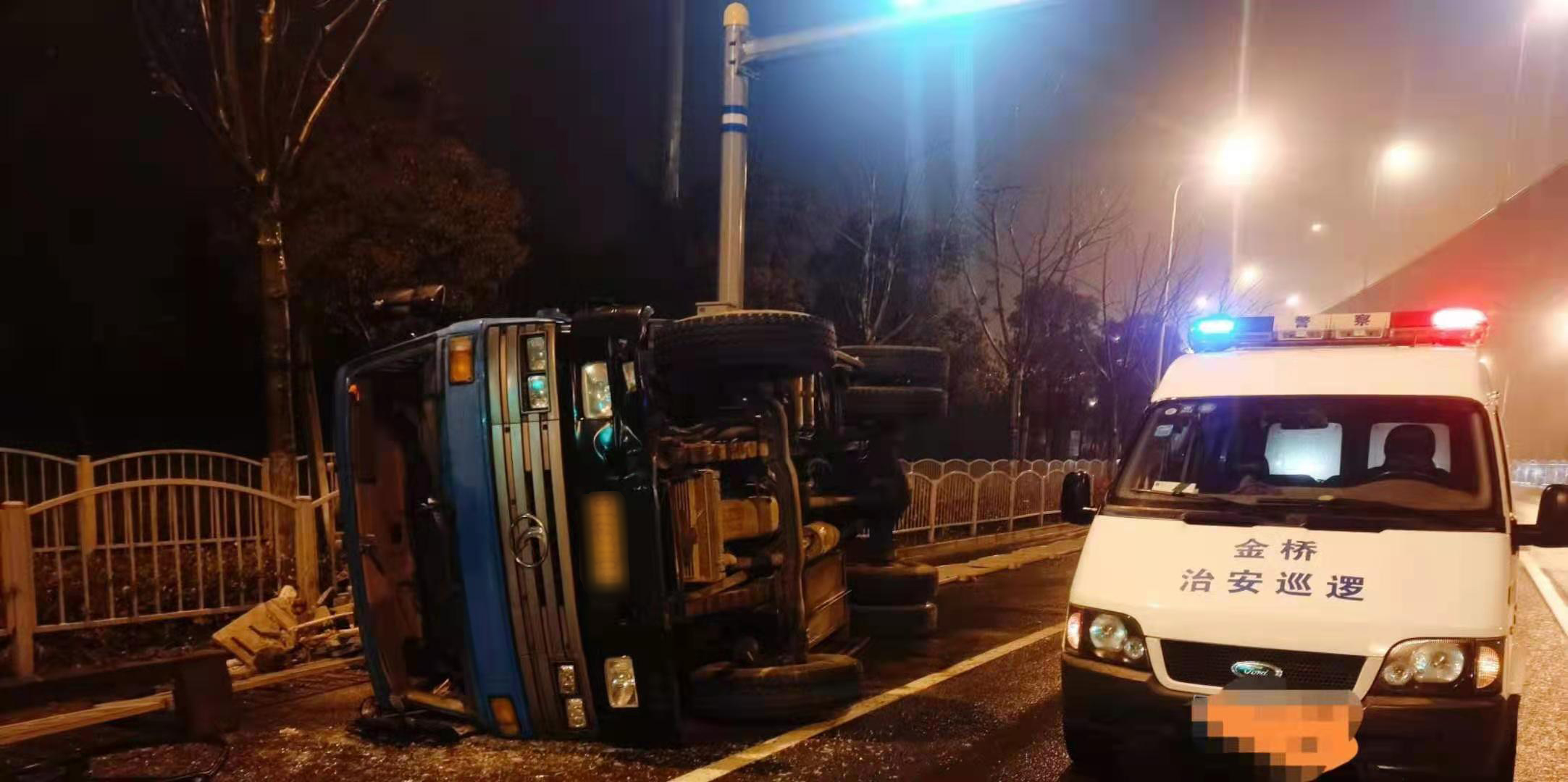當(dāng)天凌晨1:00左右,金橋派出所值班室接到路人報(bào)警,稱在申江路云順路有一輛拉滿渣土的貨車因?yàn)橛晏炻坊囁龠^快發(fā)生了側(cè)翻。
