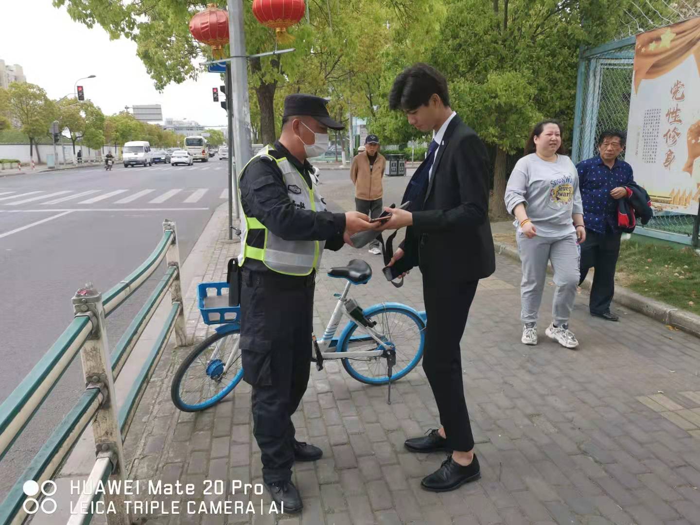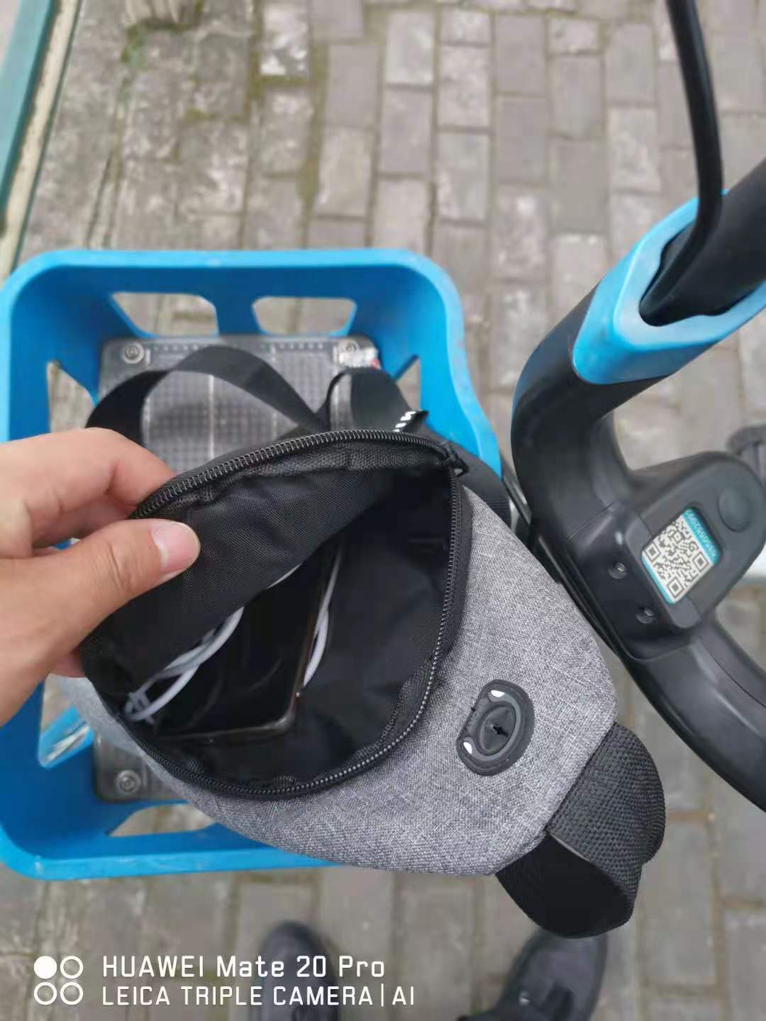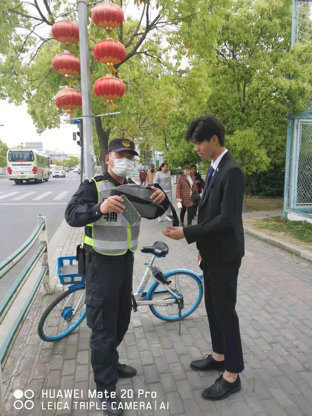 當天12:10, 徐建在沈梅東路163號社區(qū)衛(wèi)生服務中心值勤時,發(fā)現(xiàn)在路口的共享單車車筐里有一個斜挎包無人認領,包內(nèi)有一部新手機、充電器和耳機等物品。因擔心斜挎包被非失主拿走,在無法聯(lián)系失主、又考慮到失主可能會回來尋找的情況下,徐建便在原地等待。