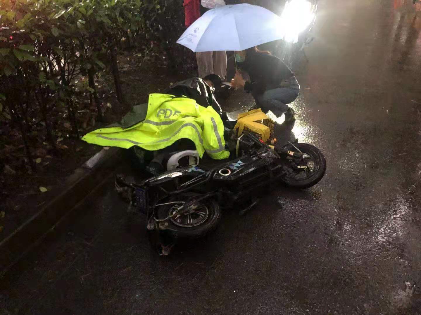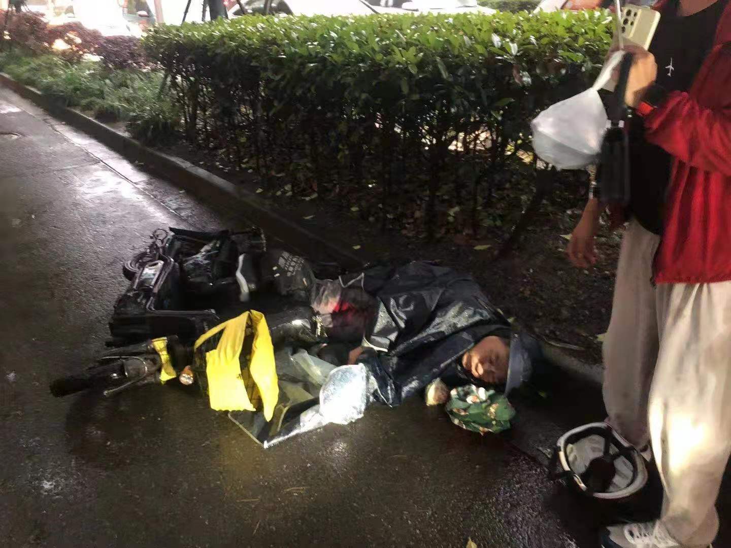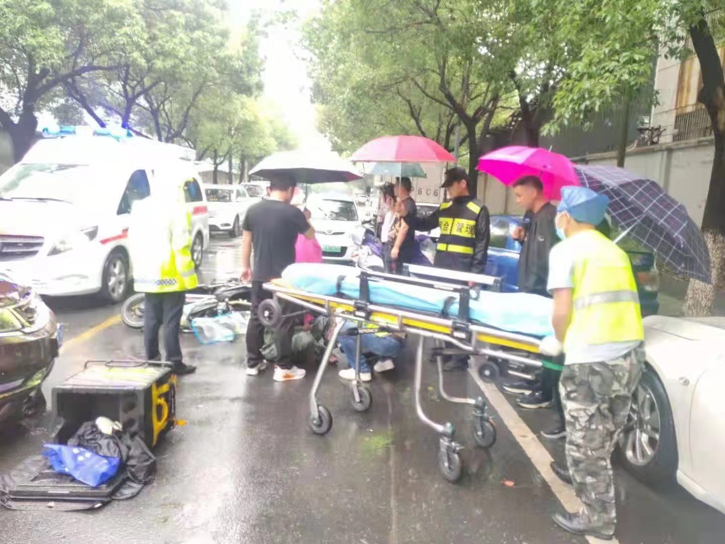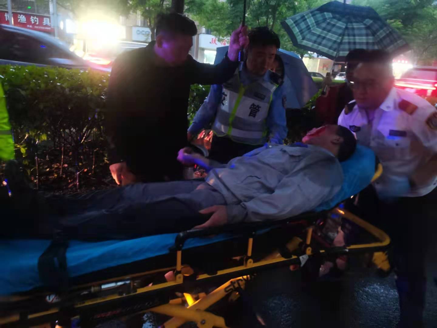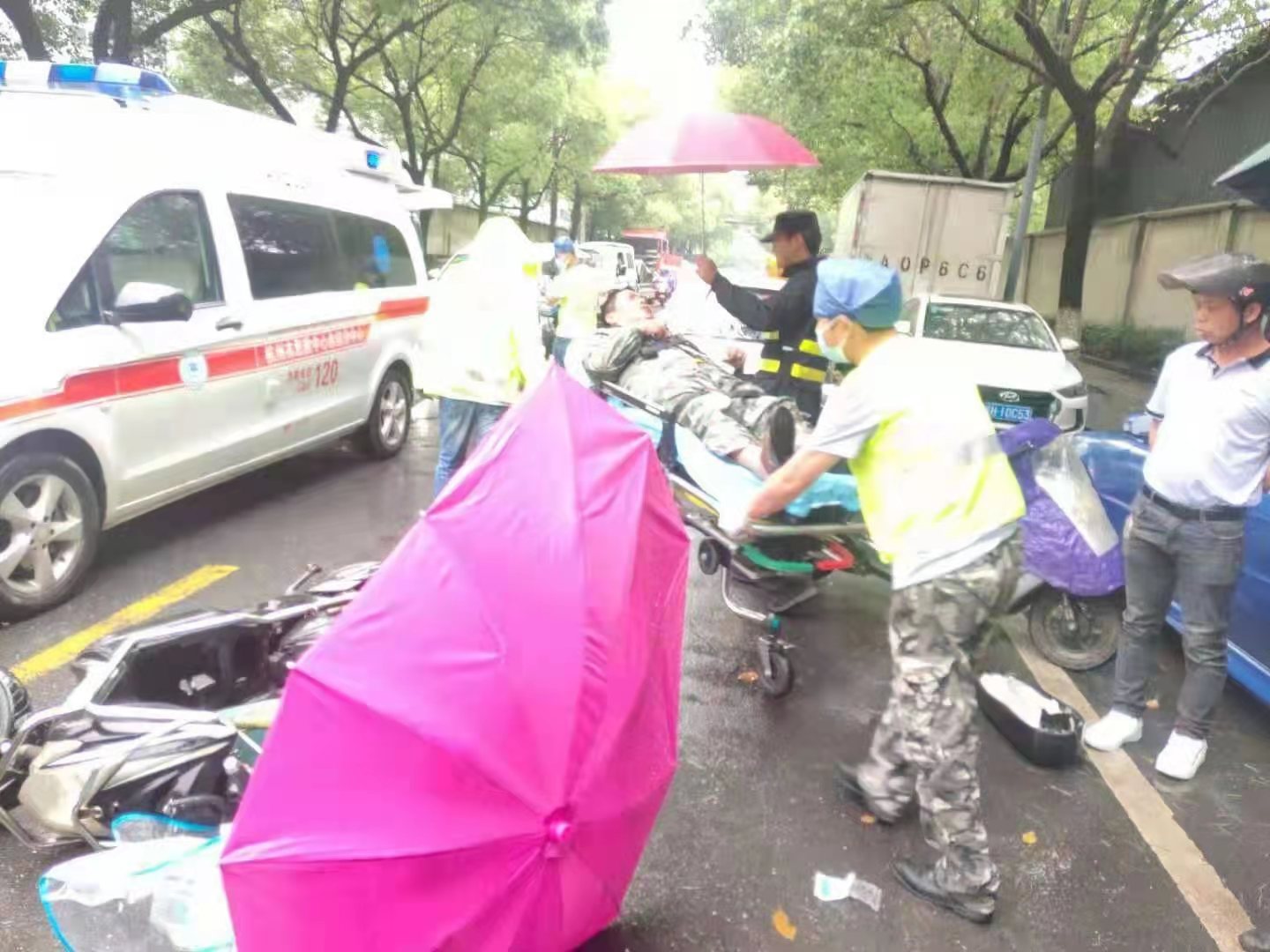 當時天正下著大雨,因擔心長時間淋雨受傷男子會感冒,細心的孫義強跑到附近商鋪,借來雨傘為等待救護的男子撐傘避雨。同時,為防止二次交通事故傷害,王衛(wèi)強在現(xiàn)場進行交通疏導。
