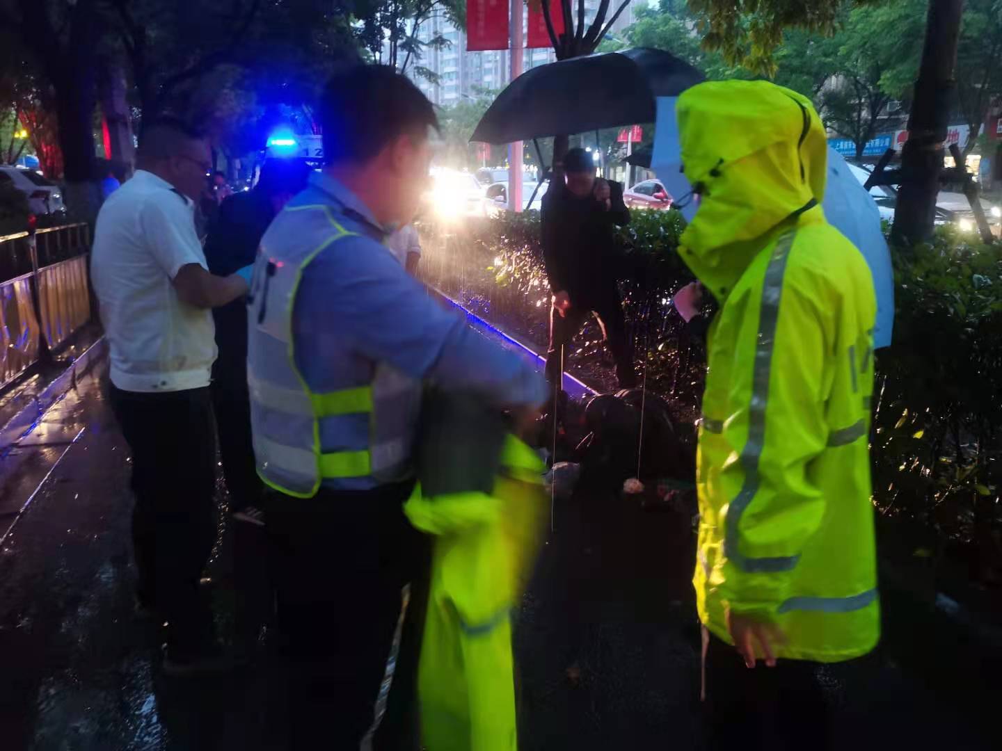 當時天正下著大雨,因擔心長時間淋雨受傷老人會感冒,夏松連忙將雨衣脫下,蓋在老人身上遮擋雨水。隨后,夏松將情況上報組長牛洪武,并與組長帶到現(xiàn)場的幾名隊員一道疏導圍觀人群,維護現(xiàn)場交通秩序。