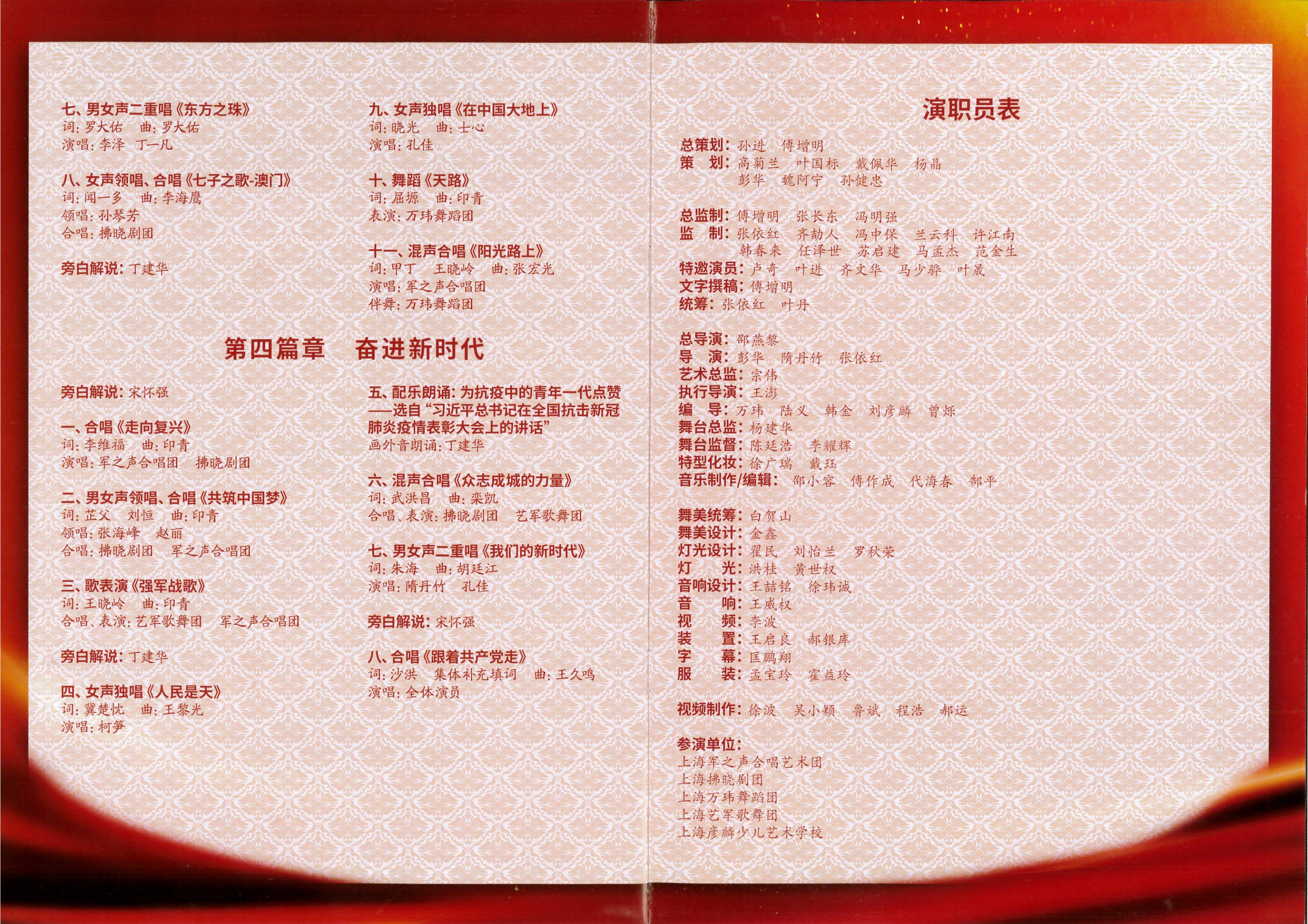 演出從6月8日開始至6月10日結(jié)束,包含四個篇章:“崢嶸歲月稠”“日月?lián)Q新天”“奔涌東方潮”“奮進(jìn)新時代”,分別反映了黨在新民主主義革命、社會主義革命和建設(shè)時期,改革開放和中國特色社會主義進(jìn)入新時代這四個階段,團(tuán)結(jié)帶領(lǐng)中國人民不斷從勝利走向勝利的光輝歷程。
