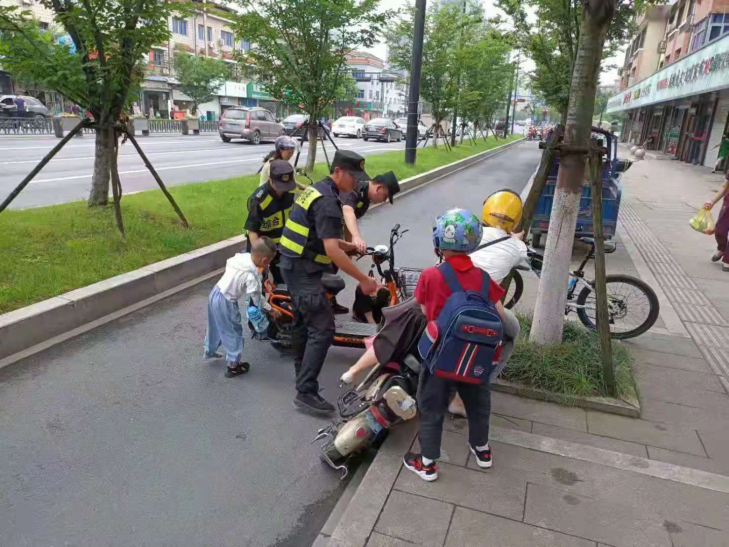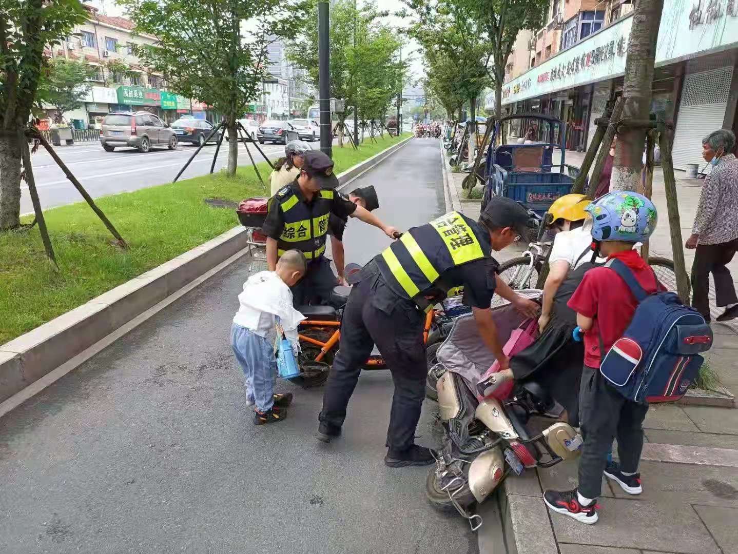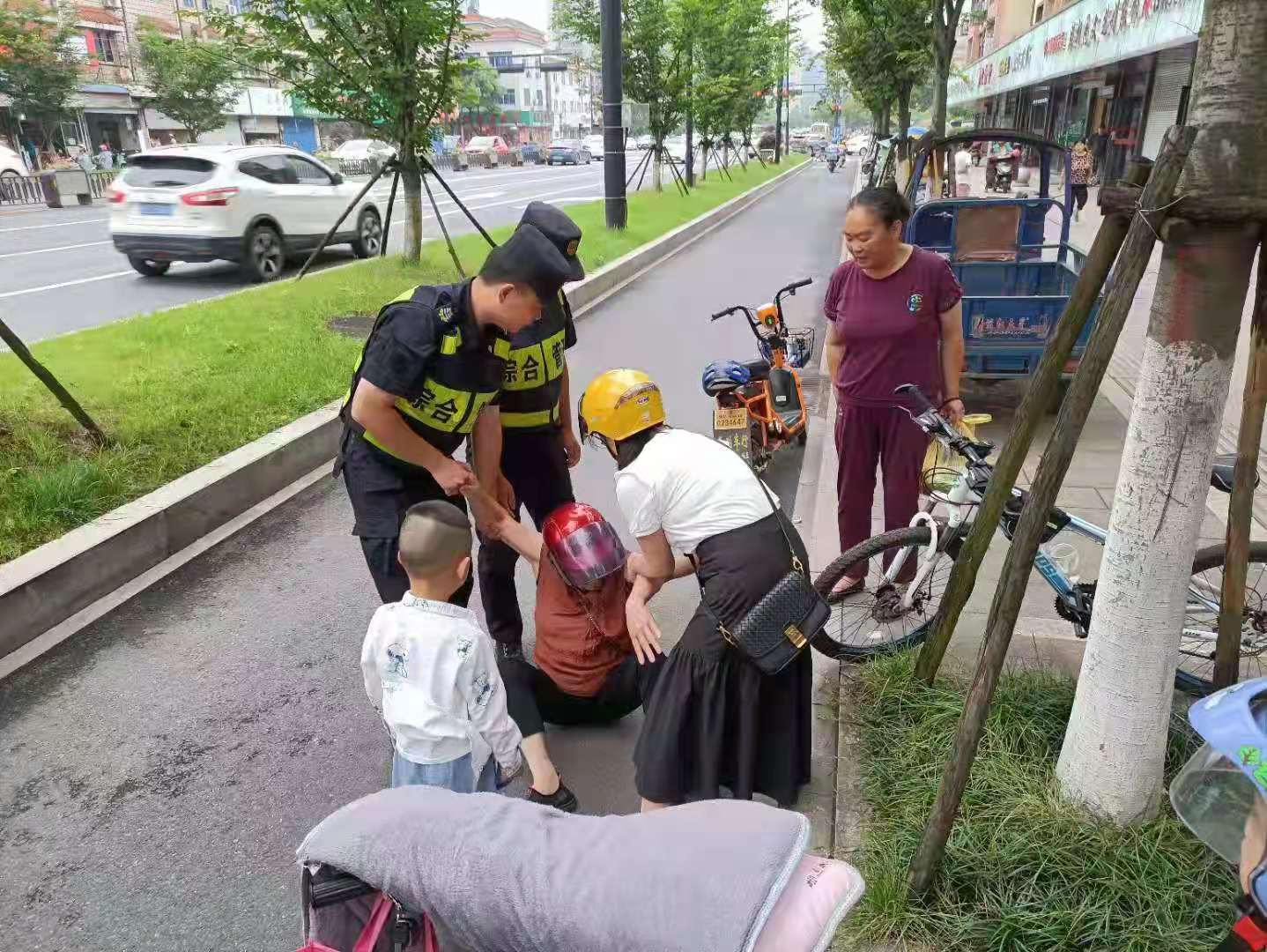 當(dāng)日8:05,正值學(xué)生上學(xué)高峰時間段,李川、朱鵬旭、強志楊3人沿著中泰路由西向東巡邏時,突然看到前方兩輛電瓶車追尾相撞,一位老人和電瓶車摔倒在地上。