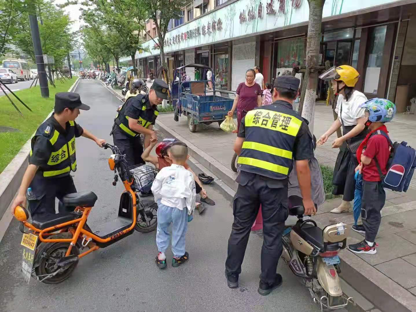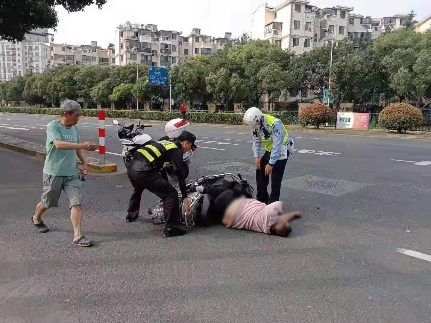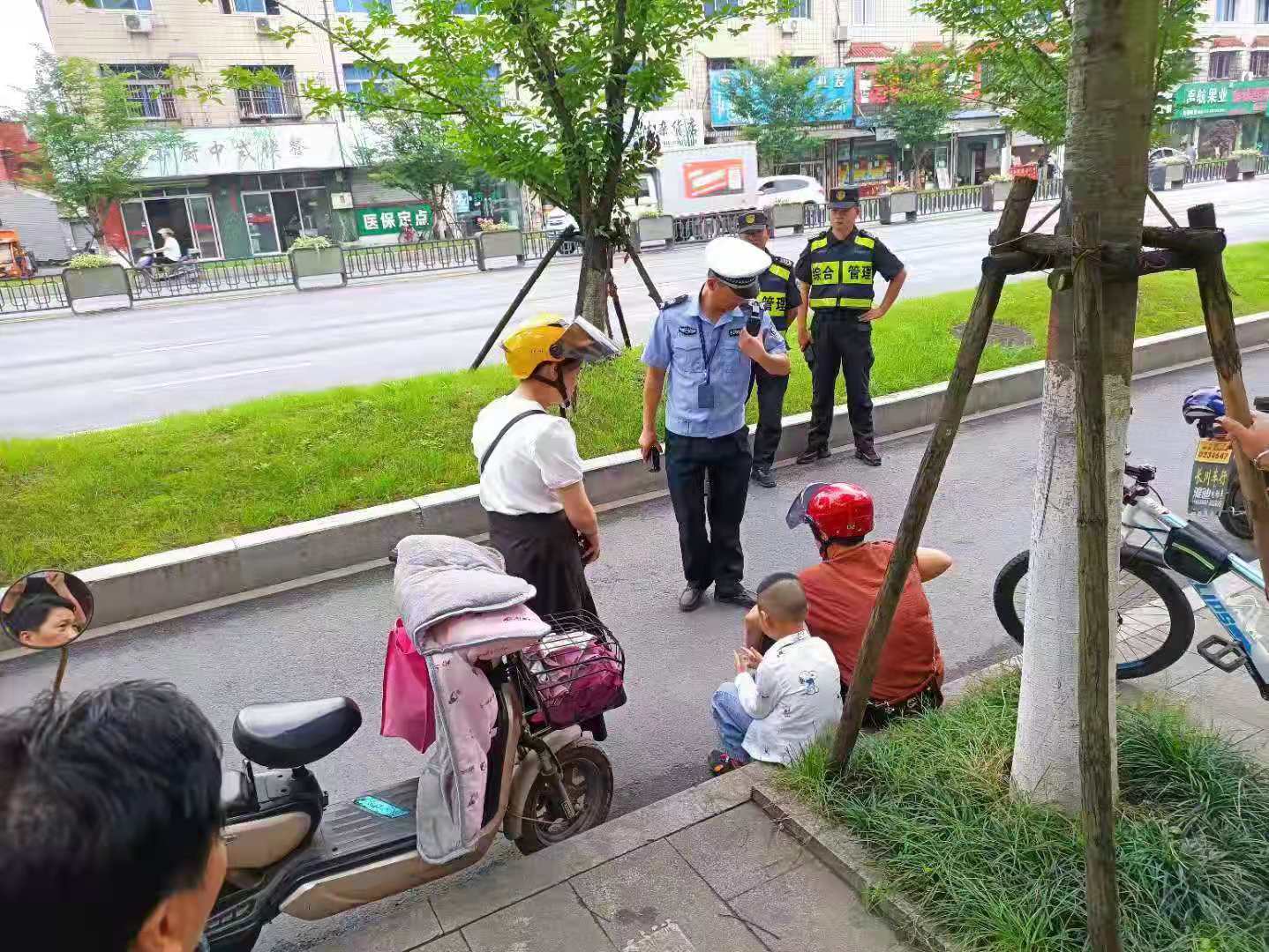 當(dāng)日8:05,正值學(xué)生上學(xué)高峰時間段,李川、朱鵬旭、強志楊3人沿著中泰路由西向東巡邏時,突然看到前方兩輛電瓶車追尾相撞,一位老人和電瓶車摔倒在地上。