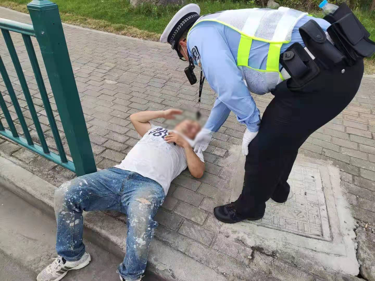 當(dāng)天7:20,昝金偉、張建建巡邏至上南路聯(lián)豐路路口時遇到一起交通事故,一名男子撞上了路邊的標(biāo)識桿,一動不動地躺在機動車道上。
