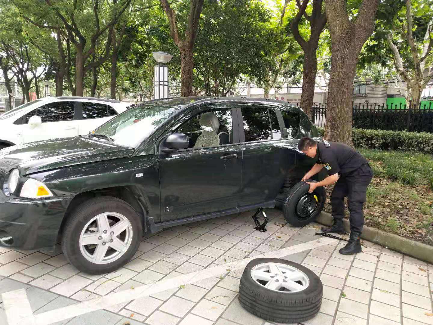 輪胎扎釘無法行 隊員換胎解難題—市委黨校項目隊員幫助黨校學員更換車備胎