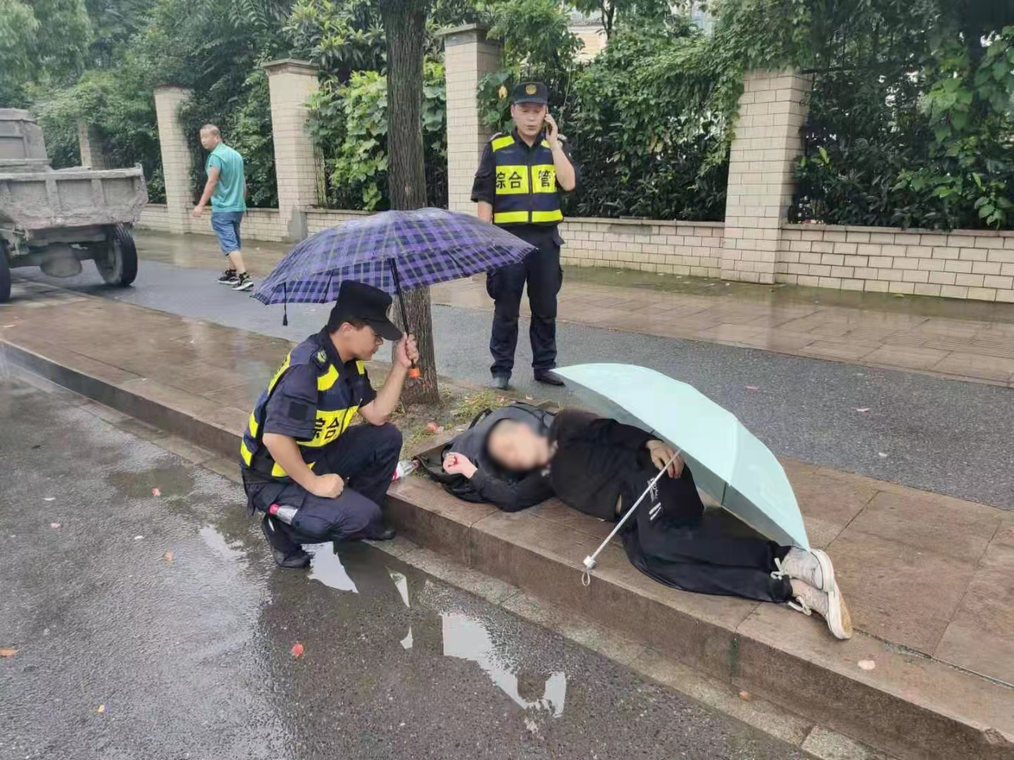 張騰剛走近男子就聞到一股濃烈的酒味,呂劍強嘗試叫醒男子,但醉酒男子沒有反應。此時正在下雨,兩人便撐起雨傘為其遮雨,并將情況向組長報告。