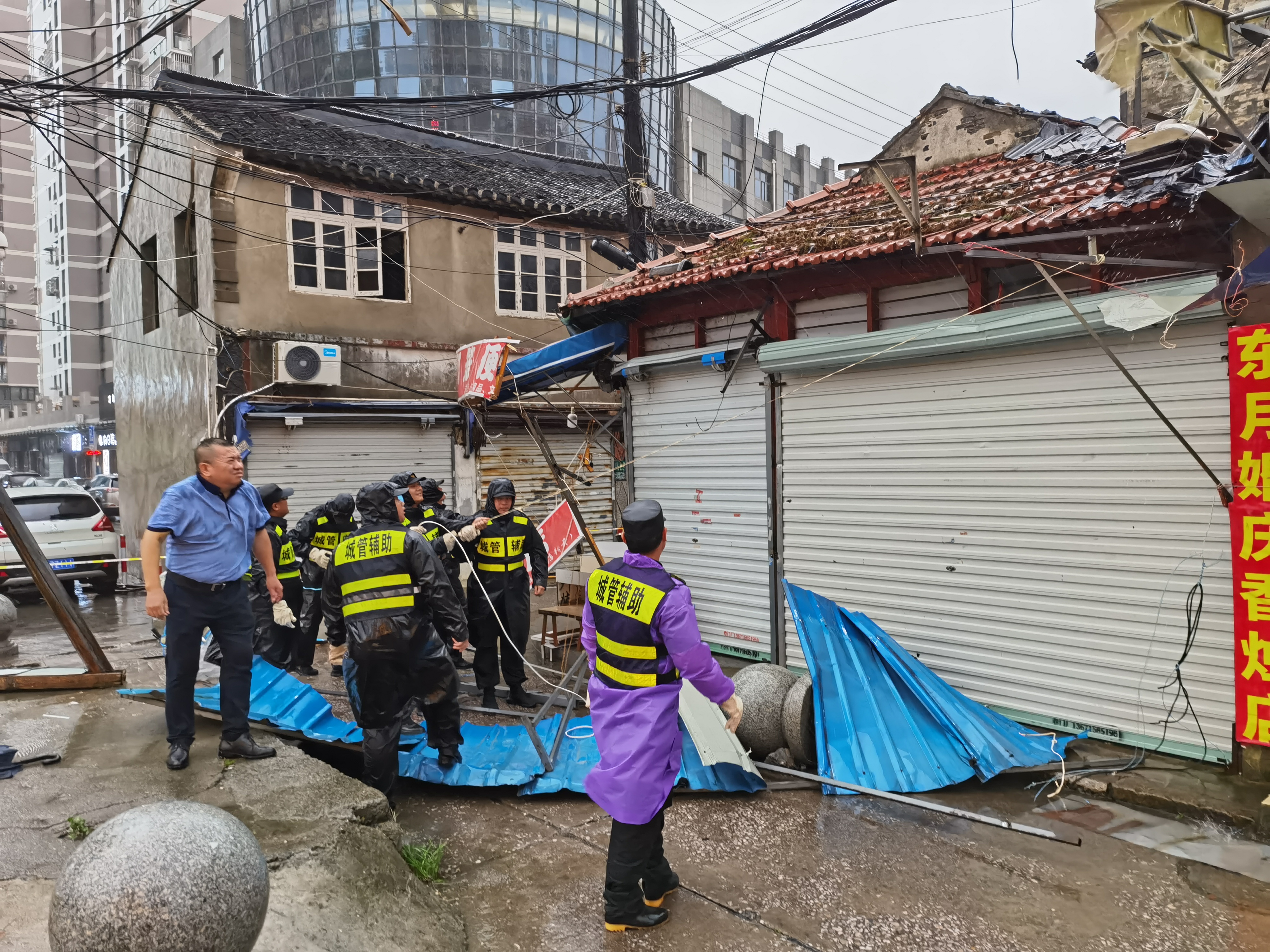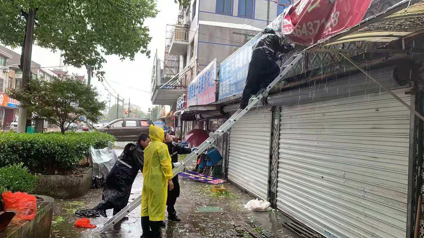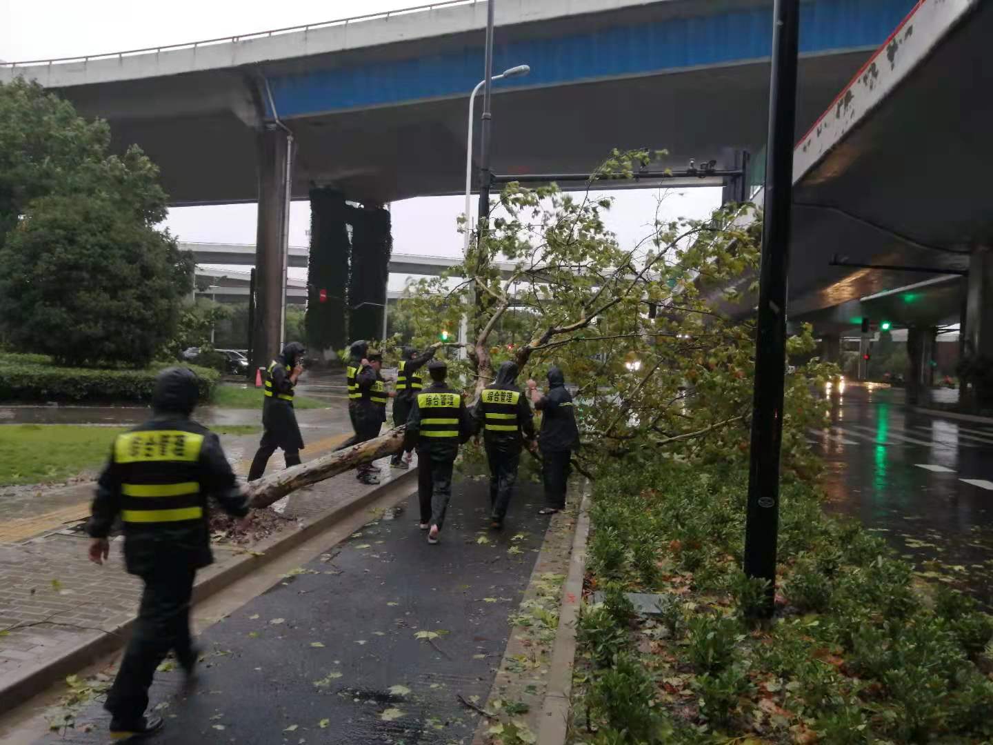 馬路兩旁,宗保隊(duì)員利用大風(fēng)暫停間隙,清理傾倒的樹(shù)木。