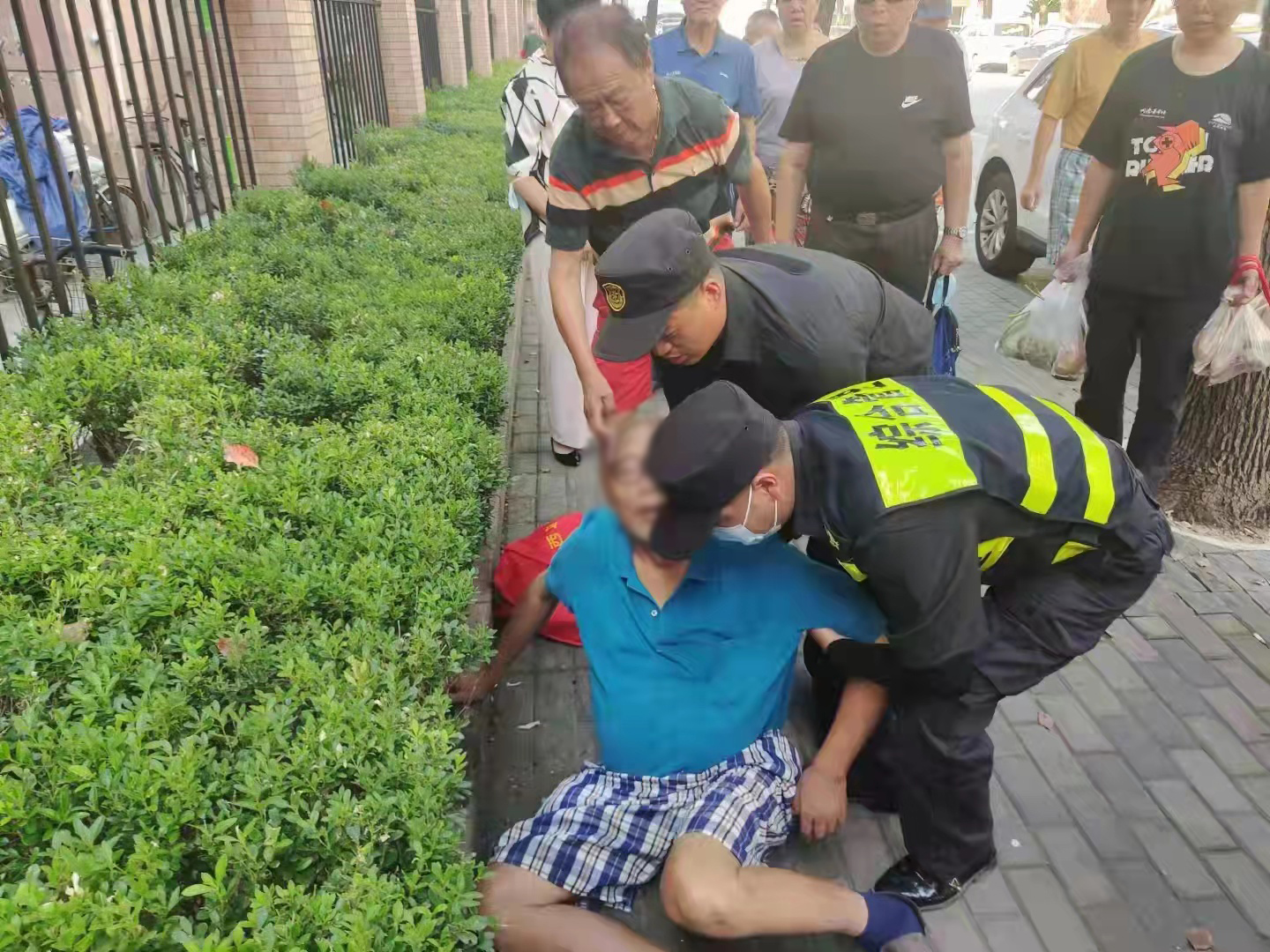 當日8:15,劉大旺、王龍祥巡邏至楊南路洪山路路口恒宇小區(qū)西側(cè)時,發(fā)現(xiàn)一位老人躺在地上,嘴巴張開,狀態(tài)不對。劉大旺立即上前喊了兩聲老人家,但老人意識已經(jīng)模糊不清了,無法發(fā)出聲音來。情況危急,王龍祥立馬撥打120急救電話和派出所內(nèi)部電話。