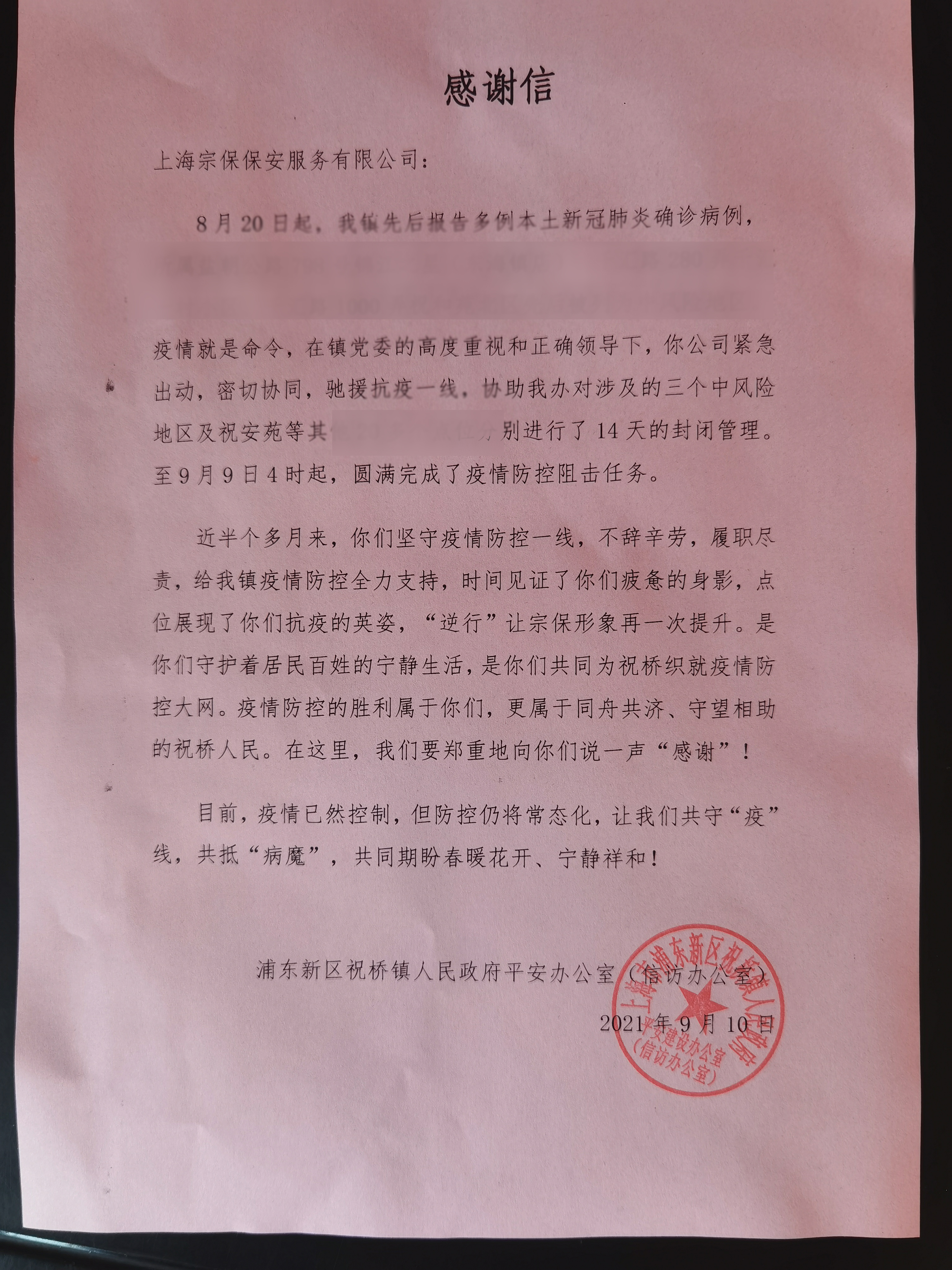 9月10日,宗保公司收到祝橋鎮(zhèn)平安辦送來(lái)的感謝信,獲贈(zèng)祝橋鎮(zhèn)航城第一居民委員會(huì)繡有“服務(wù)居民抗疫情 助力社區(qū)勇?lián)?dāng)”的錦旗,感謝宗保公司在鎮(zhèn)疫情防控工作中所做的工作。