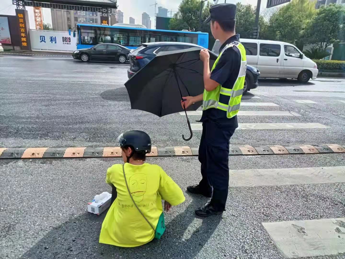 為防止發(fā)生二次意外,張龍立即在現(xiàn)場維持交通秩序,并將情況上報班組長。嚴(yán)衛(wèi)基則負(fù)責(zé)看護(hù)女子,且在女子的請求下幫忙撥打了120急救電話。天氣炎熱,細(xì)心的嚴(yán)衛(wèi)基還特地借來一把遮陽傘為女子遮擋烈日。