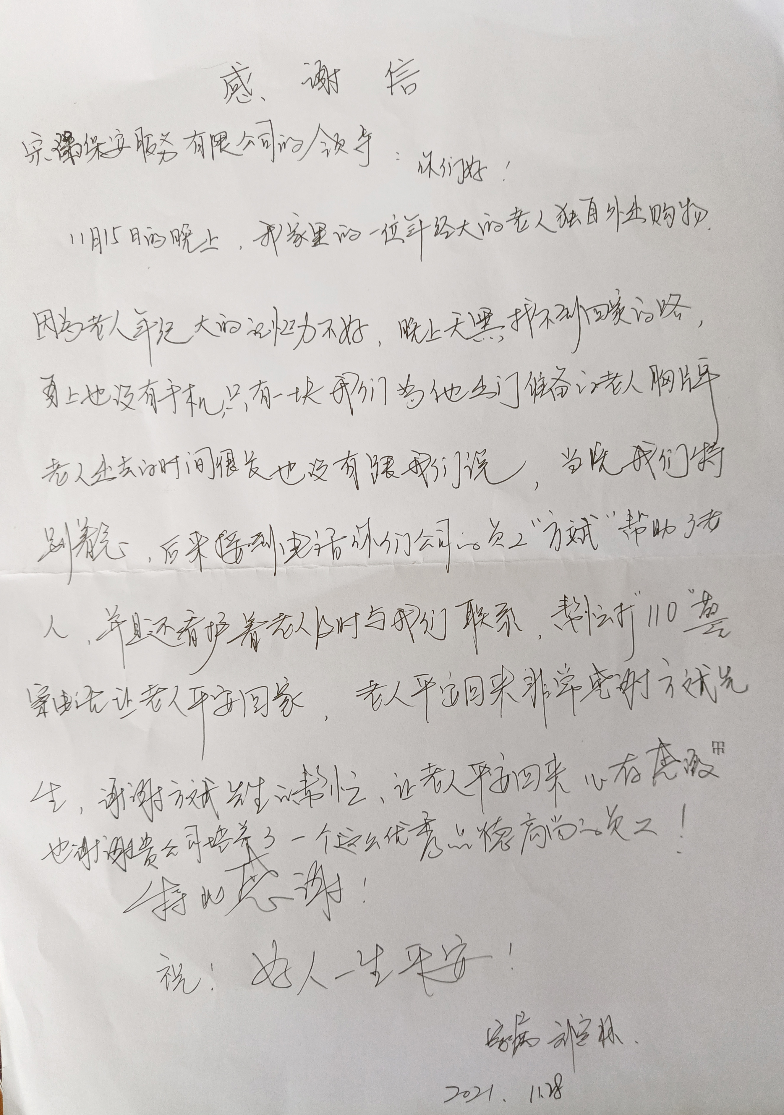 很快,民警趕到現(xiàn)場(chǎng),聯(lián)系了老人的家屬并將其送回家中。事后,老人家屬得知詳情,對(duì)宗保公司員工熱心助人的行為十分感謝,特意送來錦旗和感謝信以表達(dá)家人的感激之情。