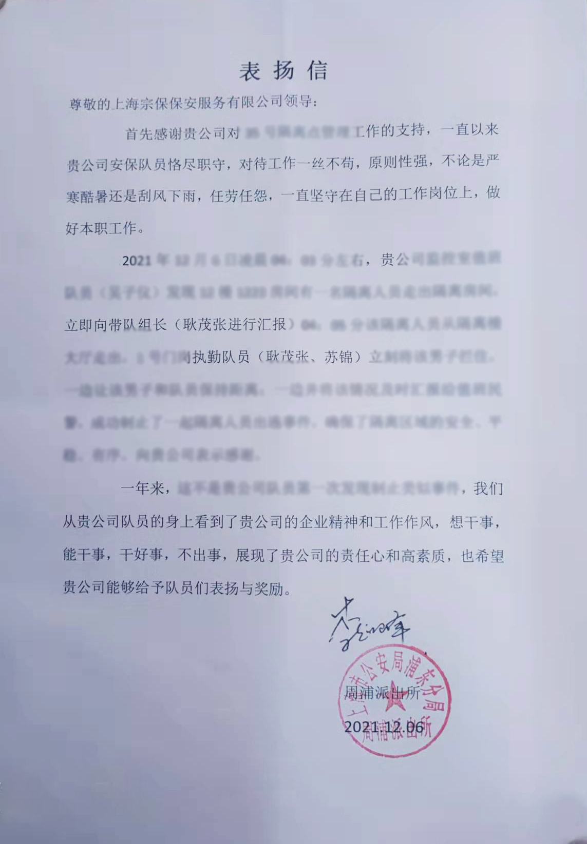 12月6日,宗保公司收到周浦派出所的表揚(yáng)信,信中對宗保員工恪盡職守、認(rèn)真細(xì)致的工作表現(xiàn)提出表揚(yáng)。