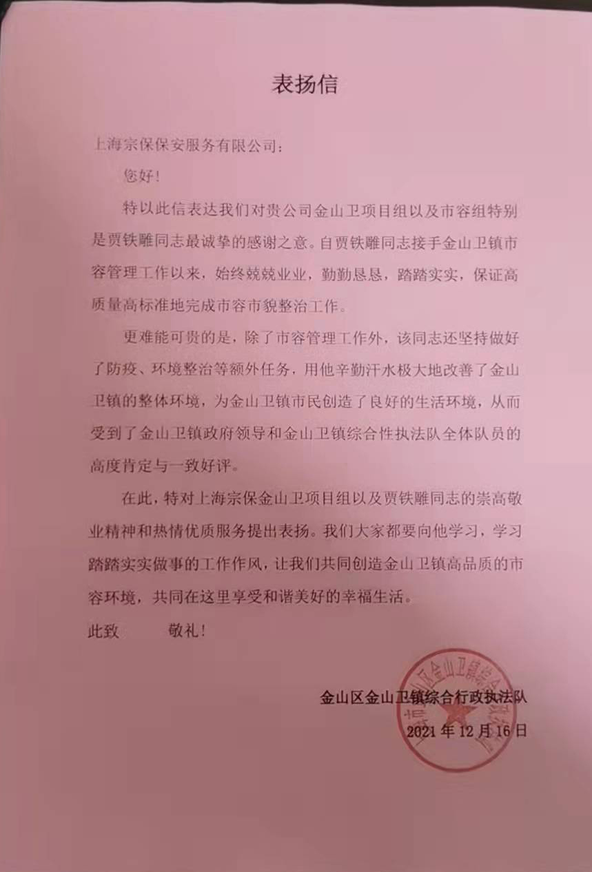 12月16日,宗保公司駐金山衛(wèi)市容項目收到金山衛(wèi)鎮(zhèn)綜合行政執(zhí)法隊的表揚信,信中對宗保隊員賈鐵雕兢兢業(yè)業(yè)的工作表現(xiàn)提出特別表揚。