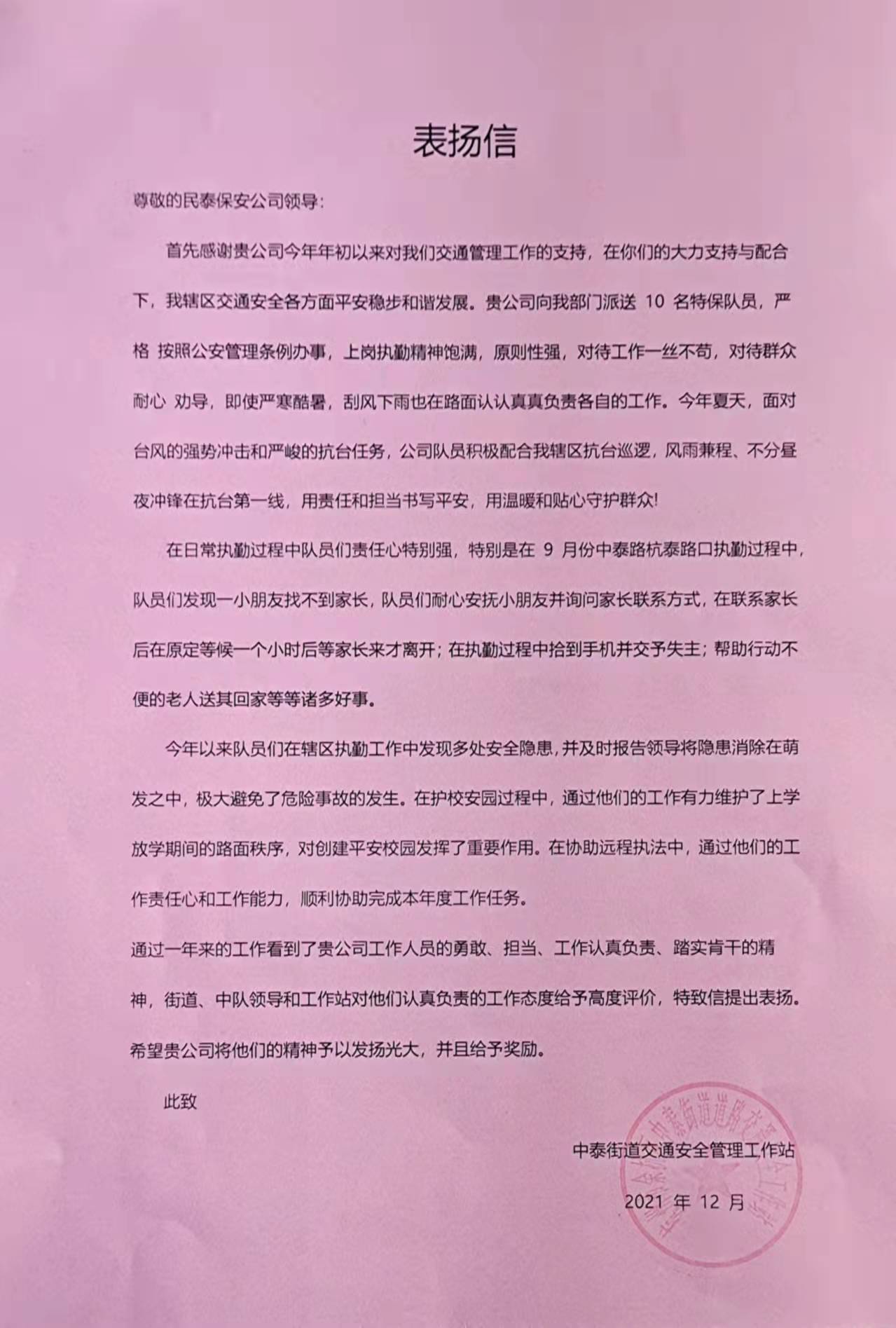 12月28日,浙江民泰公司駐中泰交管輔助項目收到余杭區(qū)中泰街道交警工作站站長王平、指導員應海松的表揚信,表揚民泰員工盡心履職突出的工作表現(xiàn)。