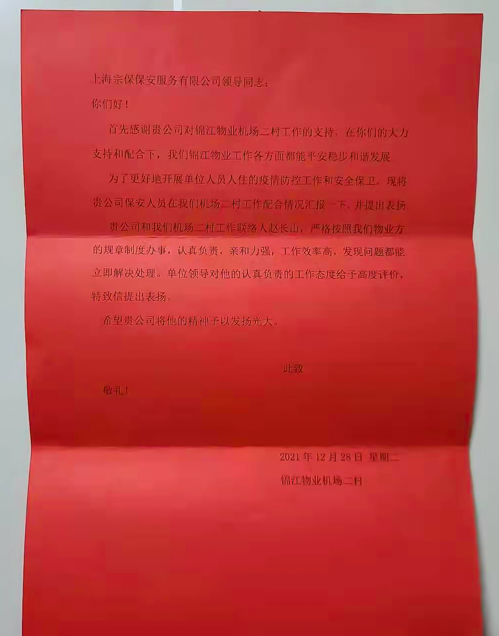 宗保隊員趙長山負責聯(lián)絡工作,在協(xié)助錦江物業(yè)機場二村開展工作中,認真負責,耐心細致,能善于發(fā)現(xiàn)問題,積極應對問題,妥善解決問題,做到了事事有安排,件件有著落,項項有回音,實現(xiàn)了工作銜接無縫隙,落實工作無差錯,其盡心履責的工作表現(xiàn),得到了甲方領導的評價和贊揚。