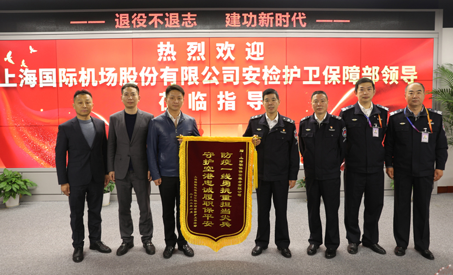 1月25日上午,上海國際機(jī)場股份有限公司安檢護(hù)衛(wèi)保障部黨委書記鮑飛榮、紀(jì)委書記陳長波將一面繡有“防疫一線勇挑重?fù)?dān)當(dāng)尖兵 守護(hù)空港忠誠履職保平安”的錦旗送到宗保公司,感謝公司對浦東機(jī)場防疫工作的大力支持和突出表現(xiàn)。