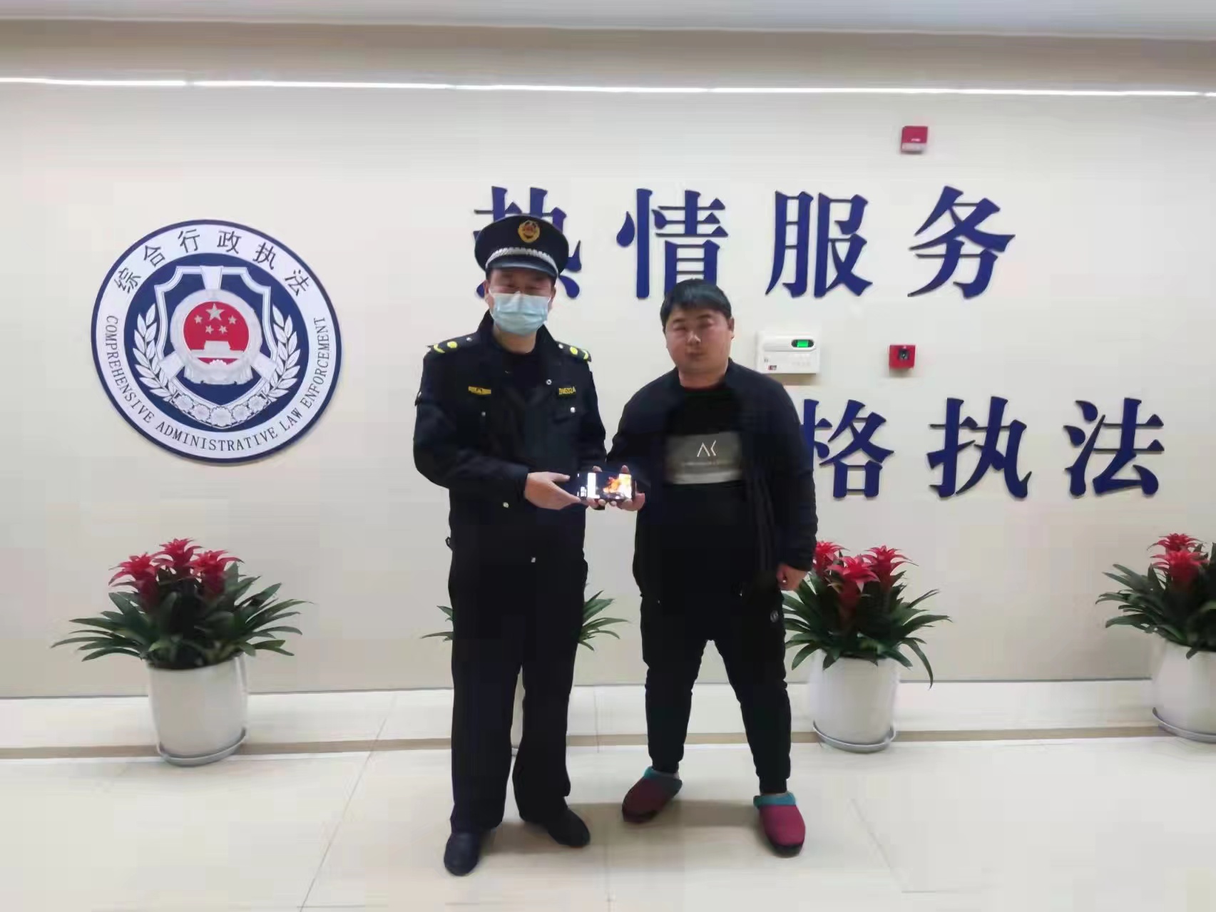 很快,一男子趕到星橋城管中隊,經(jīng)過仔細核對,確認(rèn)他是失主后,付留舉便將手機歸還給他,提醒他要保管好隨身物品。接過手機,男子再三向付留舉表示感謝。