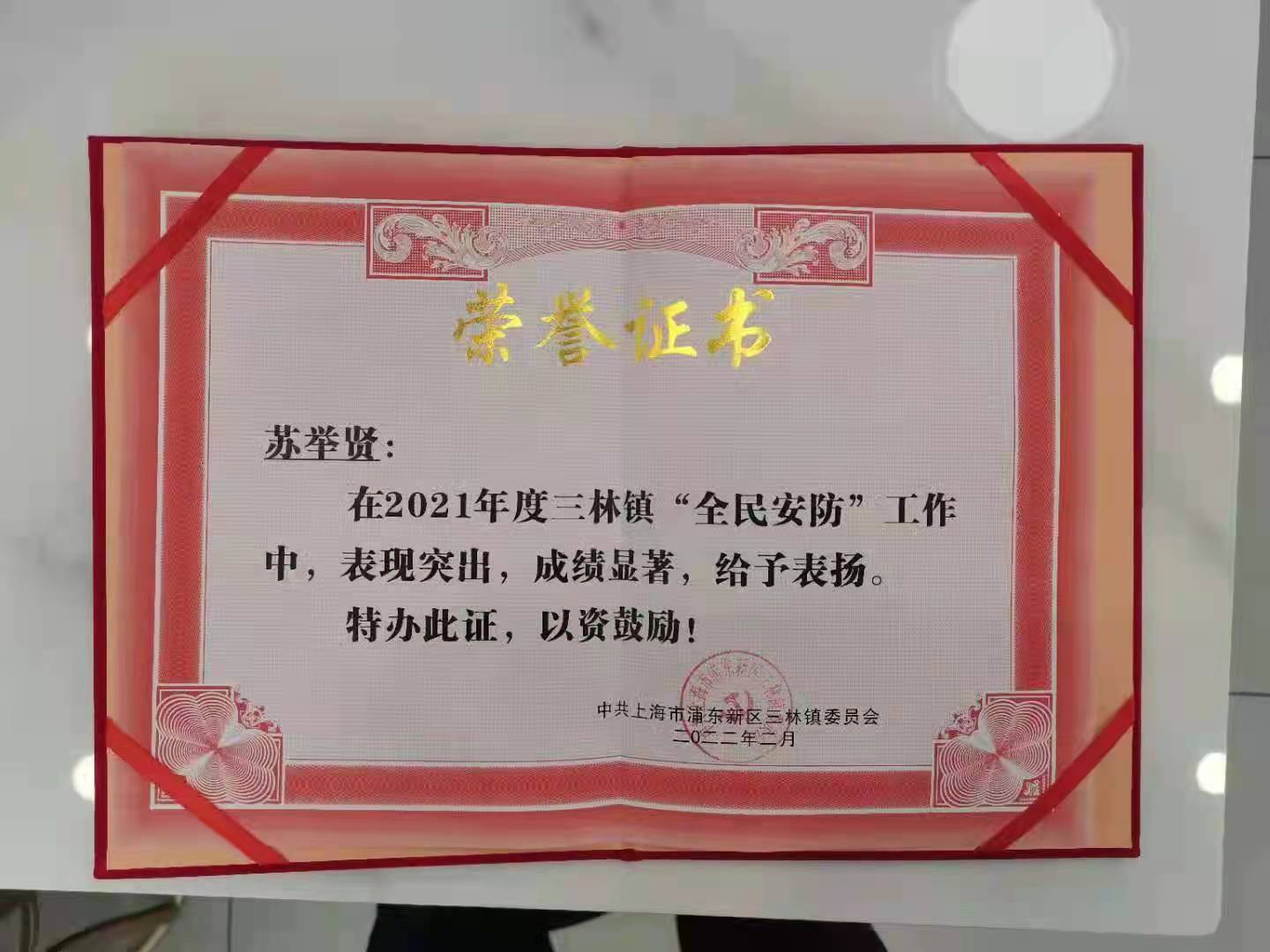 3月2日下午,三林鎮(zhèn)召開2022年政法信訪工作會議,公司駐依水園派出所項目隊員蘇舉賢在2021年度三林鎮(zhèn)“全民安防”工作中,表現(xiàn)突出,榮獲表彰。