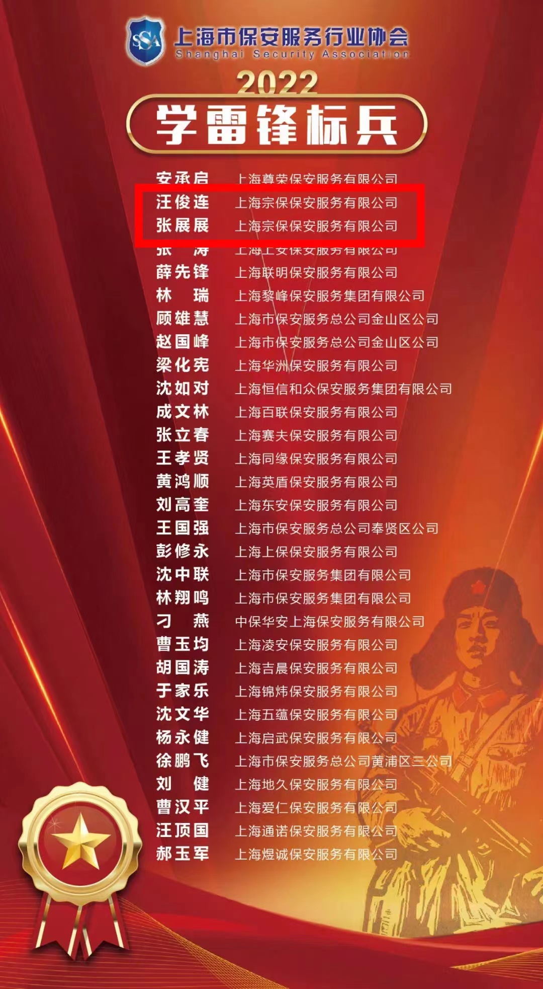 近日,上海市保安服務行業(yè)協(xié)會公布了“雷鋒崗”“學雷鋒標兵”“巾幗保安”評選結(jié)果,宗保公司1個項目隊和3名隊員分獲殊榮。