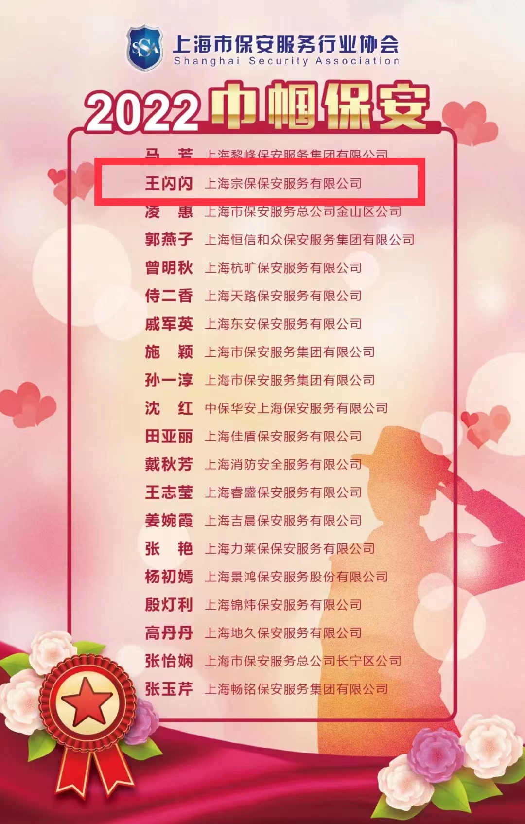 宗保公司獲上海市保安服務行業(yè)協(xié)會“雷鋒崗”“學雷鋒標兵”“巾幗保安”評選表彰