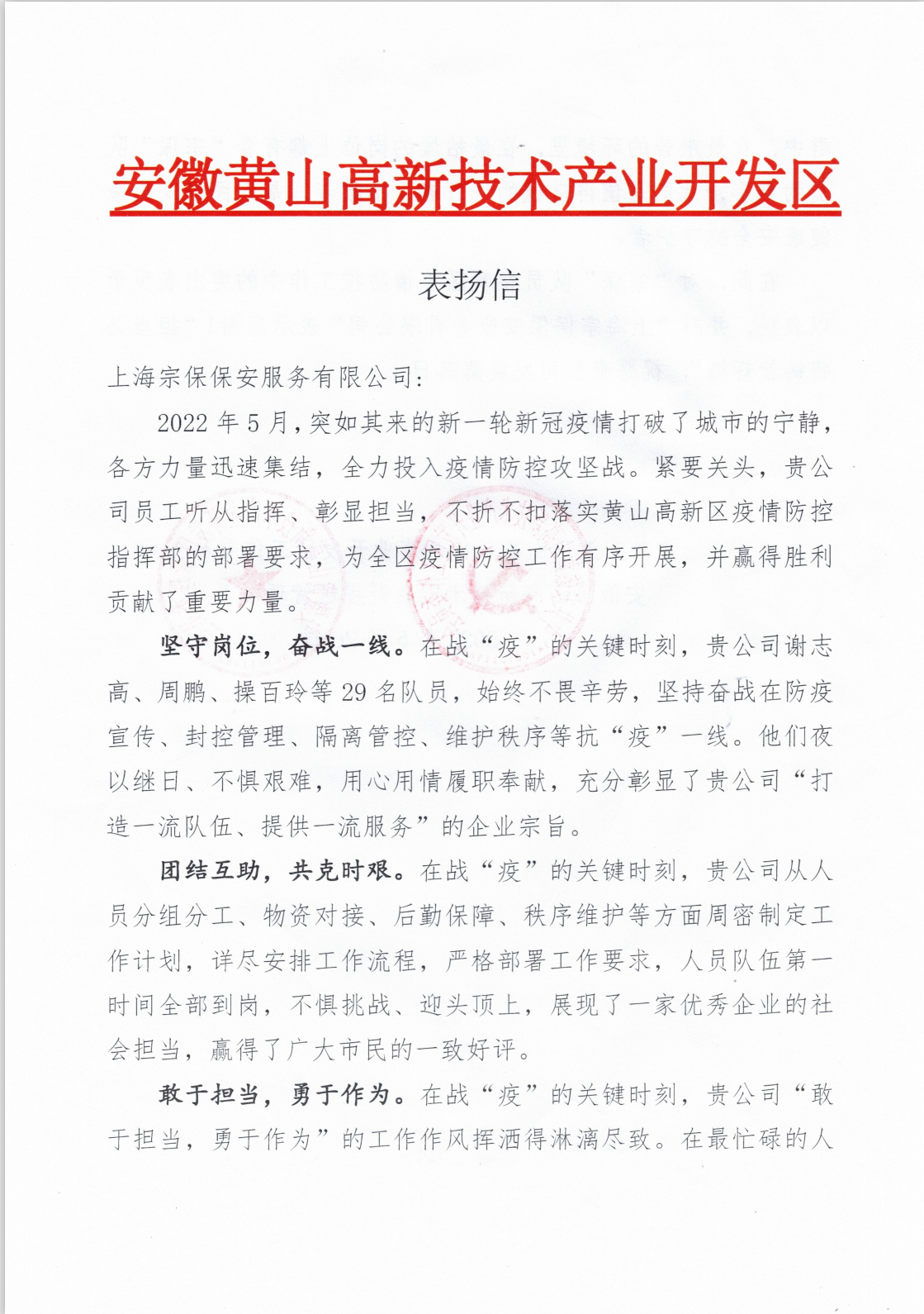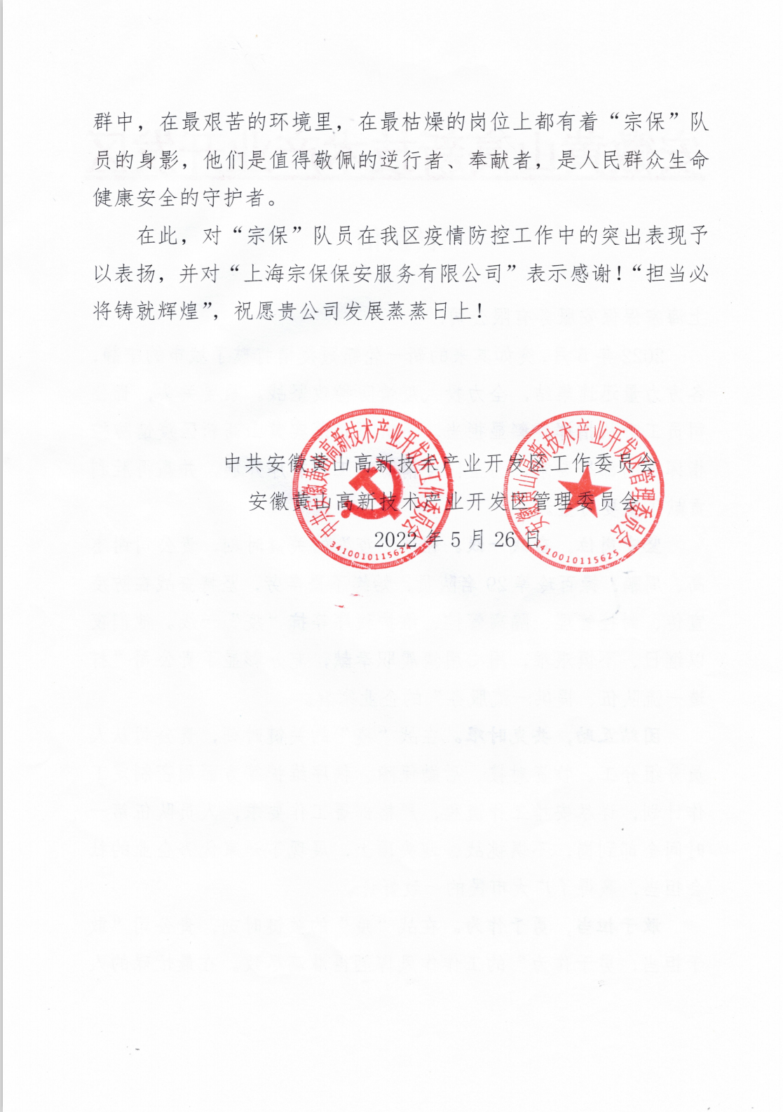 5月26日,宗保公司收到黃山高新技術(shù)產(chǎn)業(yè)開發(fā)區(qū)管理委員會的表揚信,信中感謝公司對高新區(qū)疫情防控工作的大力支持。