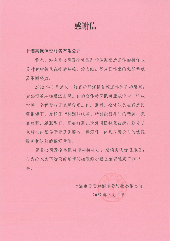 6月1日,宗保公司收到浦東公安分局楊思派出所的感謝信,信中對(duì)宗保公司全力支持和配合派出所開(kāi)展疫情防控、維護(hù)轄區(qū)治安表示感謝。