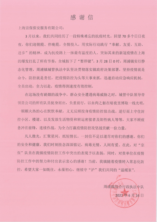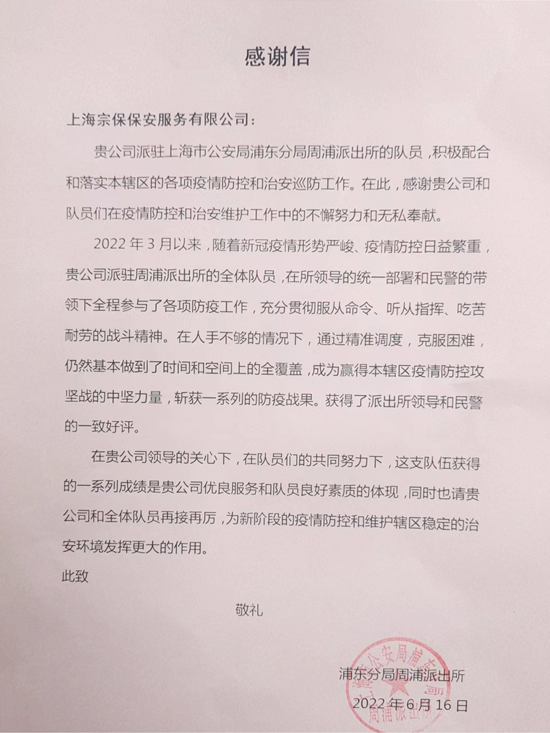 6月16日,宗保公司收到浦東公安分局周浦派出所的感謝信,信中對(duì)公司員工在疫情防控期間的辛勤付出和無(wú)私奉獻(xiàn)給予充分肯定,并表示衷心感謝。