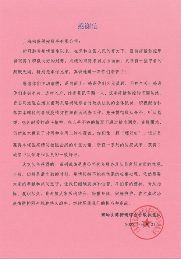 6月21日,宗保公司收到南碼頭路街道綜合行政執(zhí)法中隊(duì)的感謝信,信中對(duì)公司員工在疫情防控期間所做的工作和辛勤的付出表示衷心的感謝。