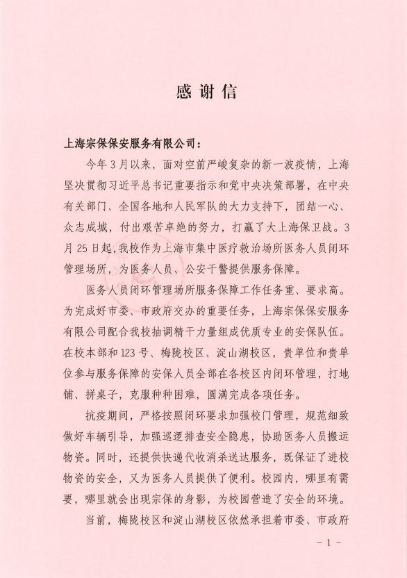 6月28日,中共上海市委黨校送來(lái)感謝信,感謝疫情防控期間宗保公司員工全力配合市委黨校為醫(yī)務(wù)人員提供有力的服務(wù)保障。