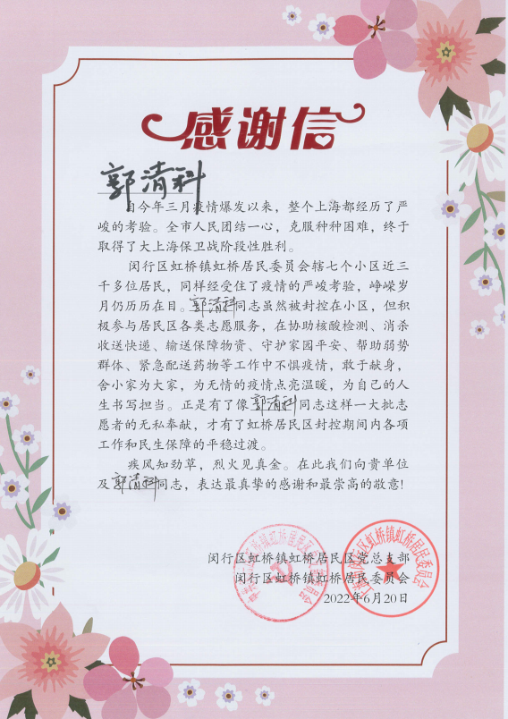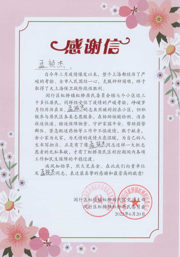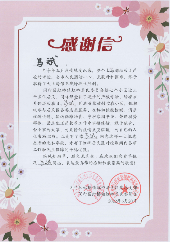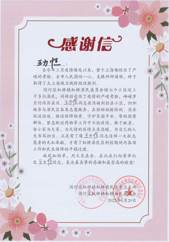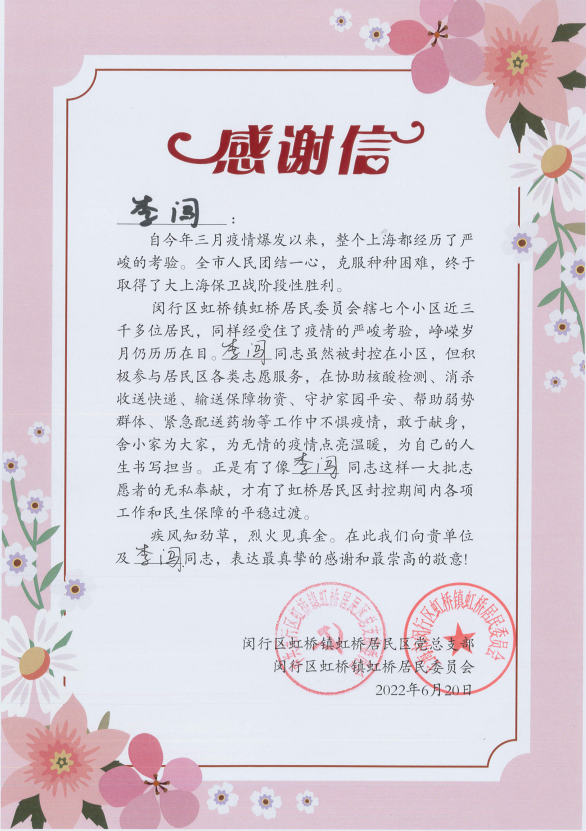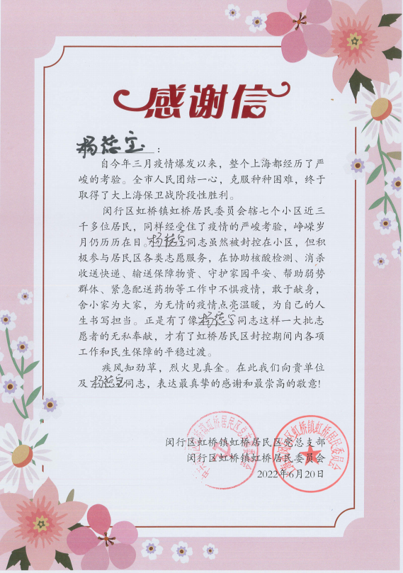6月30日,閔行區(qū)虹橋鎮(zhèn)虹橋居民區(qū)黨總支部和閔行區(qū)虹橋鎮(zhèn)虹橋居民委員會(huì)送來(lái)感謝信,真摯地感謝疫情防控期間宗保員工全力配合居委開(kāi)展疫情防控所做的工作。