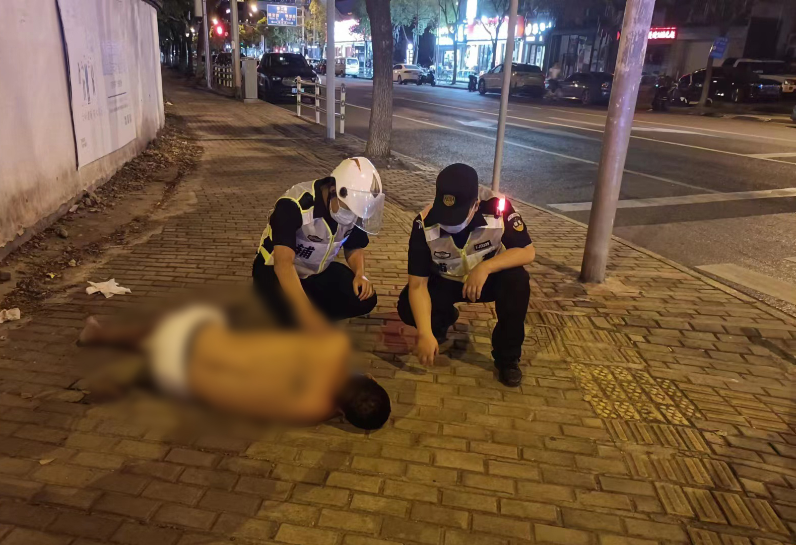 當(dāng)日23:30,張興安和楊龍巡邏至周東南路沈梅東路交叉口時,發(fā)現(xiàn)一名男子躺睡在路邊,便立即上前察看。男子赤裸著上身,渾身散發(fā)著酒味。兩人多次試圖叫醒他,但男子酒可能喝得太多,依舊昏睡不醒。