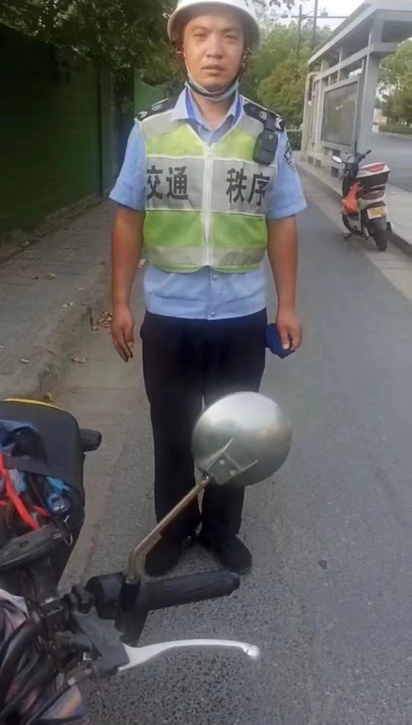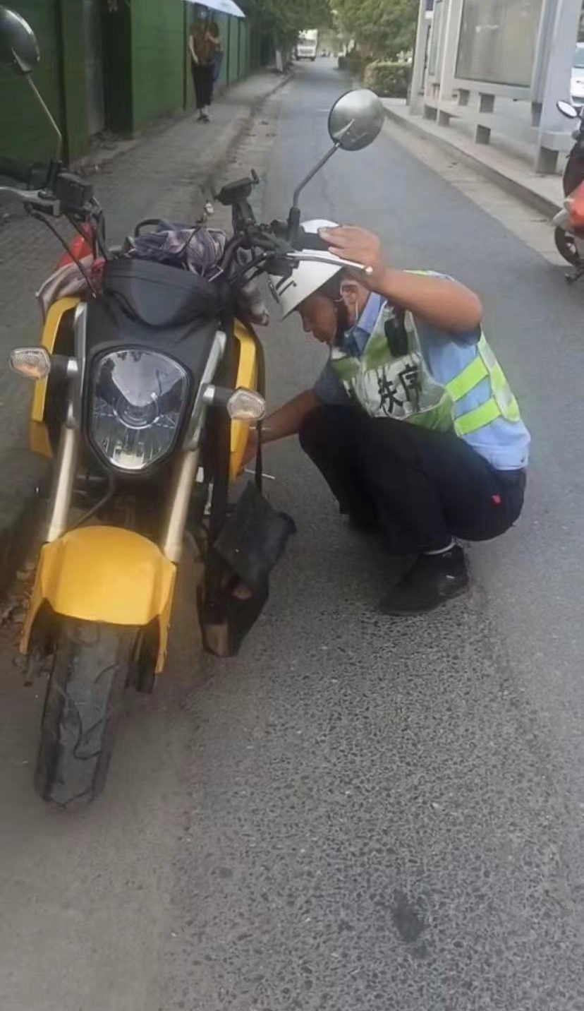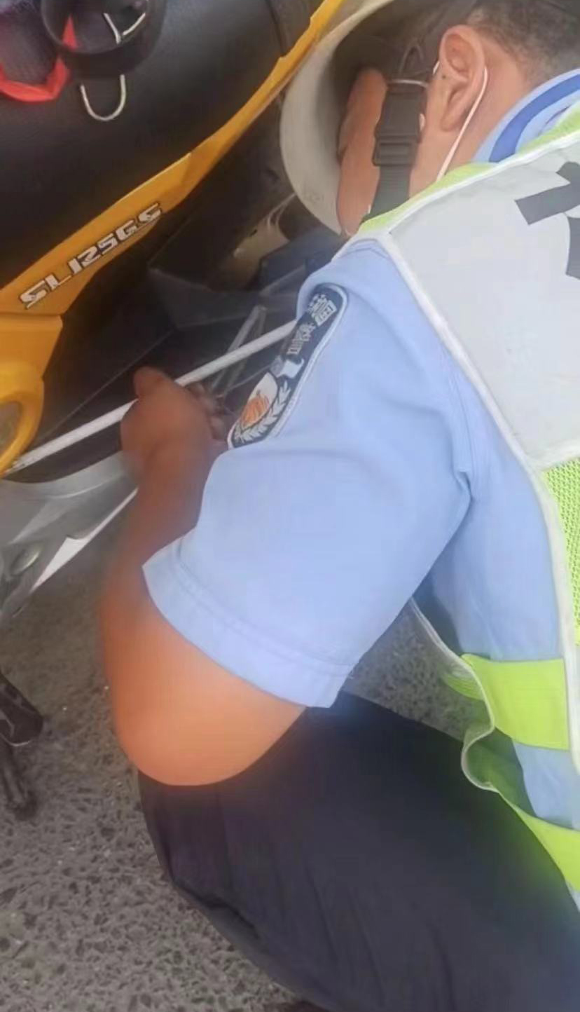 當(dāng)日6:50,郭耀坤上班途徑棕櫚路疫情卡點(diǎn)附近時,看到一位老大爺滿頭大汗,推著一輛摩托車走走停停。見此情景,郭耀坤就主動上前詢問。