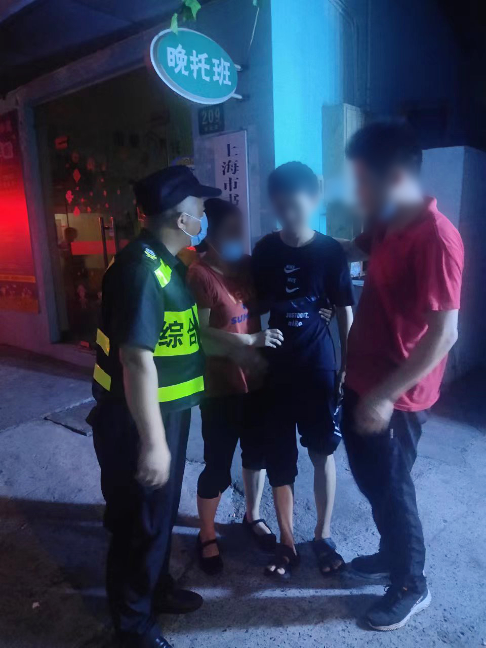 當(dāng)天21:30,顧俊在東靖路一商鋪附近巡邏時(shí),看到一棟樓的二樓樓頂邊上有一個(gè)小男孩,樓下兩位居民正焦急地勸說:“你快點(diǎn)下來吧,下來吧,上面太危險(xiǎn)了......”但小男孩好像沒有聽到一樣,不管不顧地繼續(xù)沿著樓頂邊沿移動(dòng)。