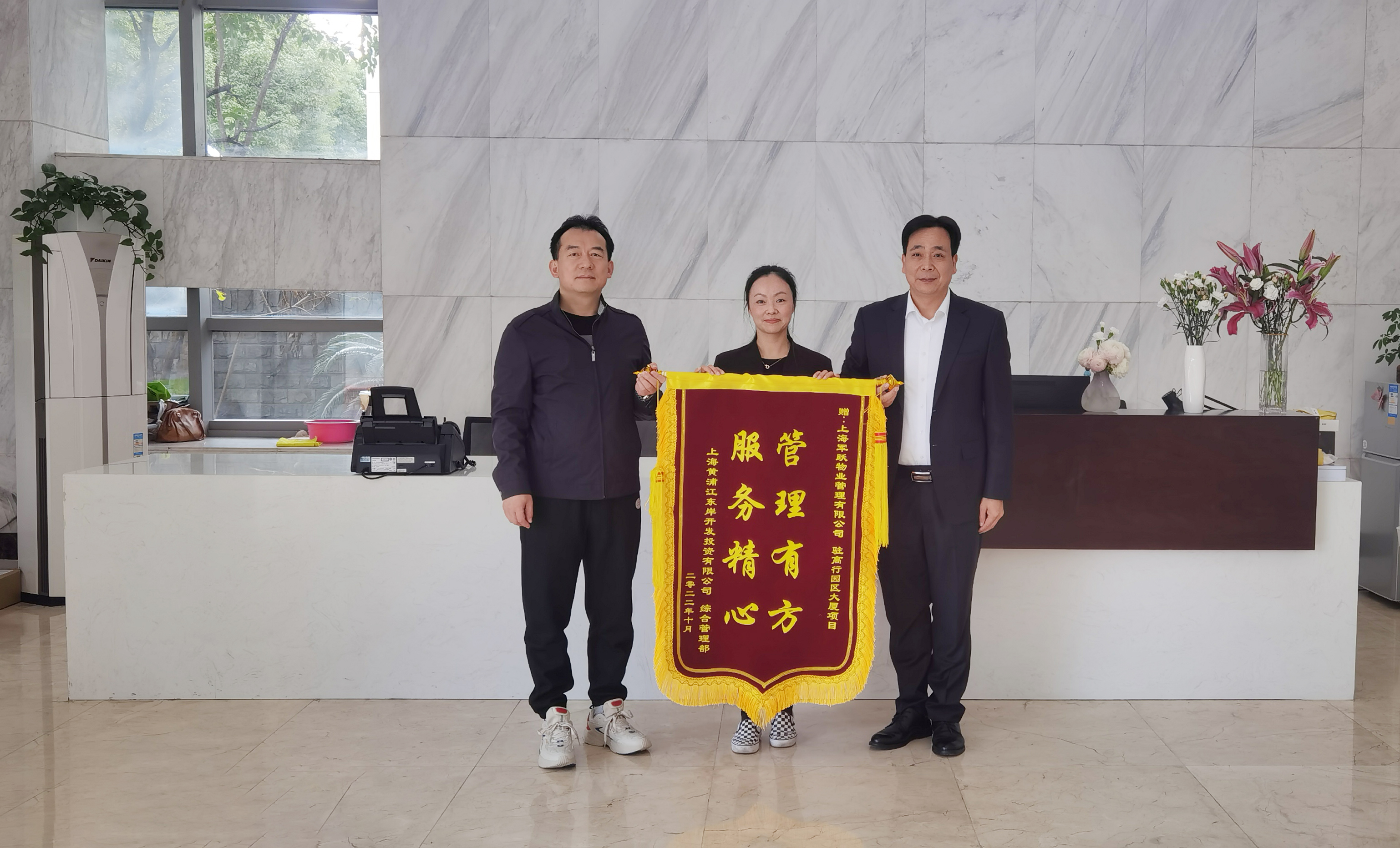 11月28日,上海黃浦江東岸開發(fā)投資有限公司綜合管理部將一面繡有“管理有方 服務(wù)精心”的錦旗送到上海軍躍物業(yè)管理有限公司駐高行園區(qū)大廈項目,對軍躍物業(yè)員工盡心盡責(zé)、周到細(xì)致的服務(wù)表示誠摯感謝。