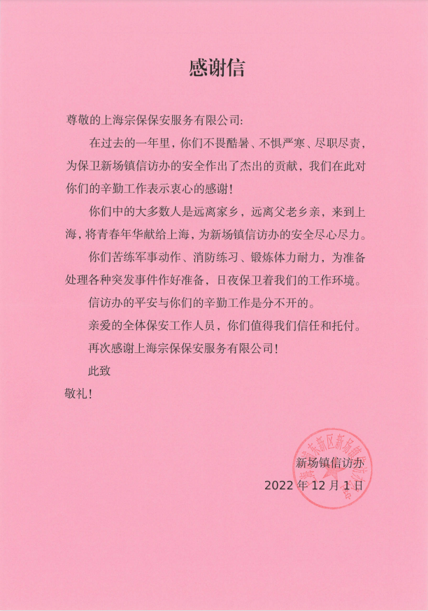 12月1日,宗保公司駐浦東新區(qū)新場鎮(zhèn)政府輔助項(xiàng)目收到鎮(zhèn)信訪辦送來的感謝信,信中對公司員工履職盡責(zé)的工作表現(xiàn)給予了充分肯定。