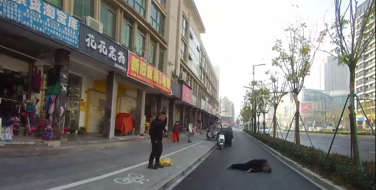 當(dāng)日10:30,公司員工楊杰和汪超巡邏至良渚街道金昌路銘雅苑附近時,遇到一路人求助,稱非機動車道上有一個男子躺倒在地上,不知道怎么回事。