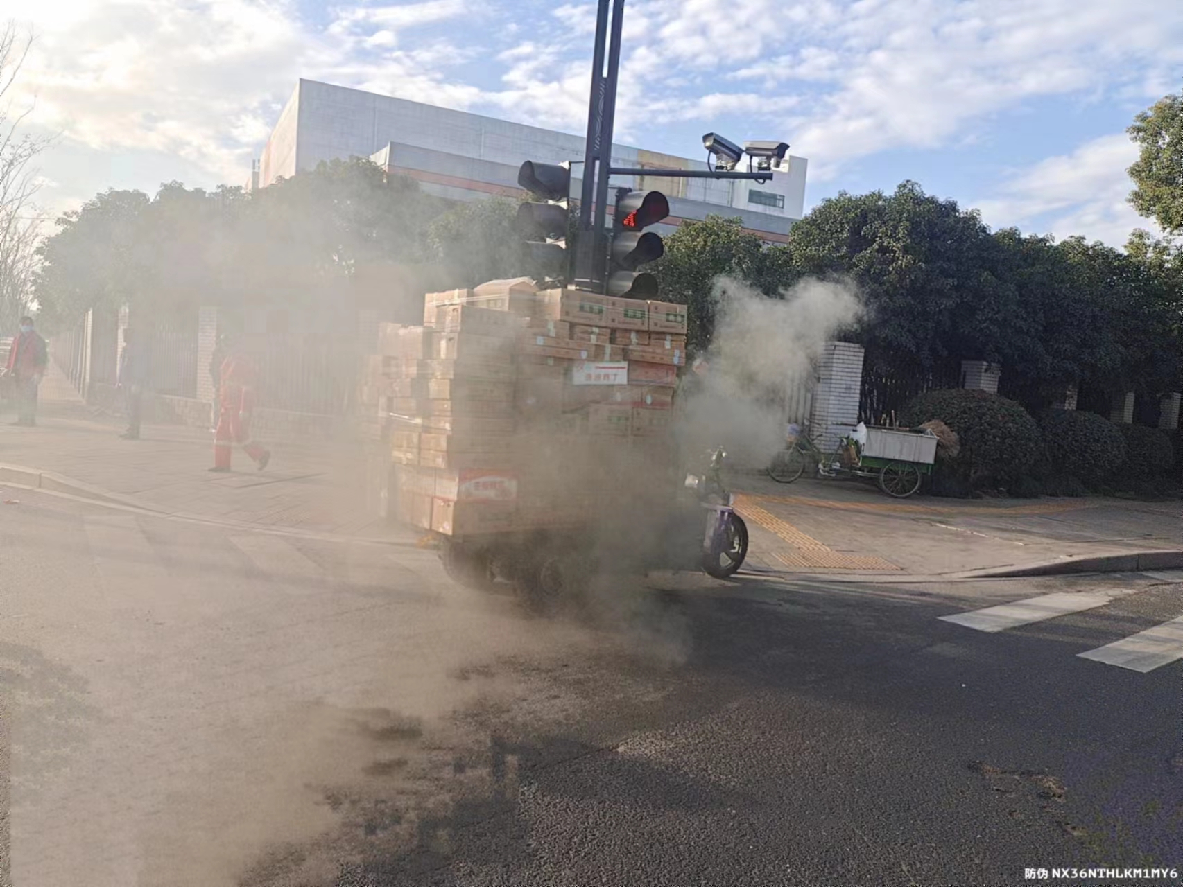當(dāng)日8:00,公司員工寧晨龍在良渚物港港虹西路與儲運路口巡邏時,突然發(fā)現(xiàn)路邊一輛滿載貨物的三輪車冒著濃煙,站在一旁的車主顯得手足無措。