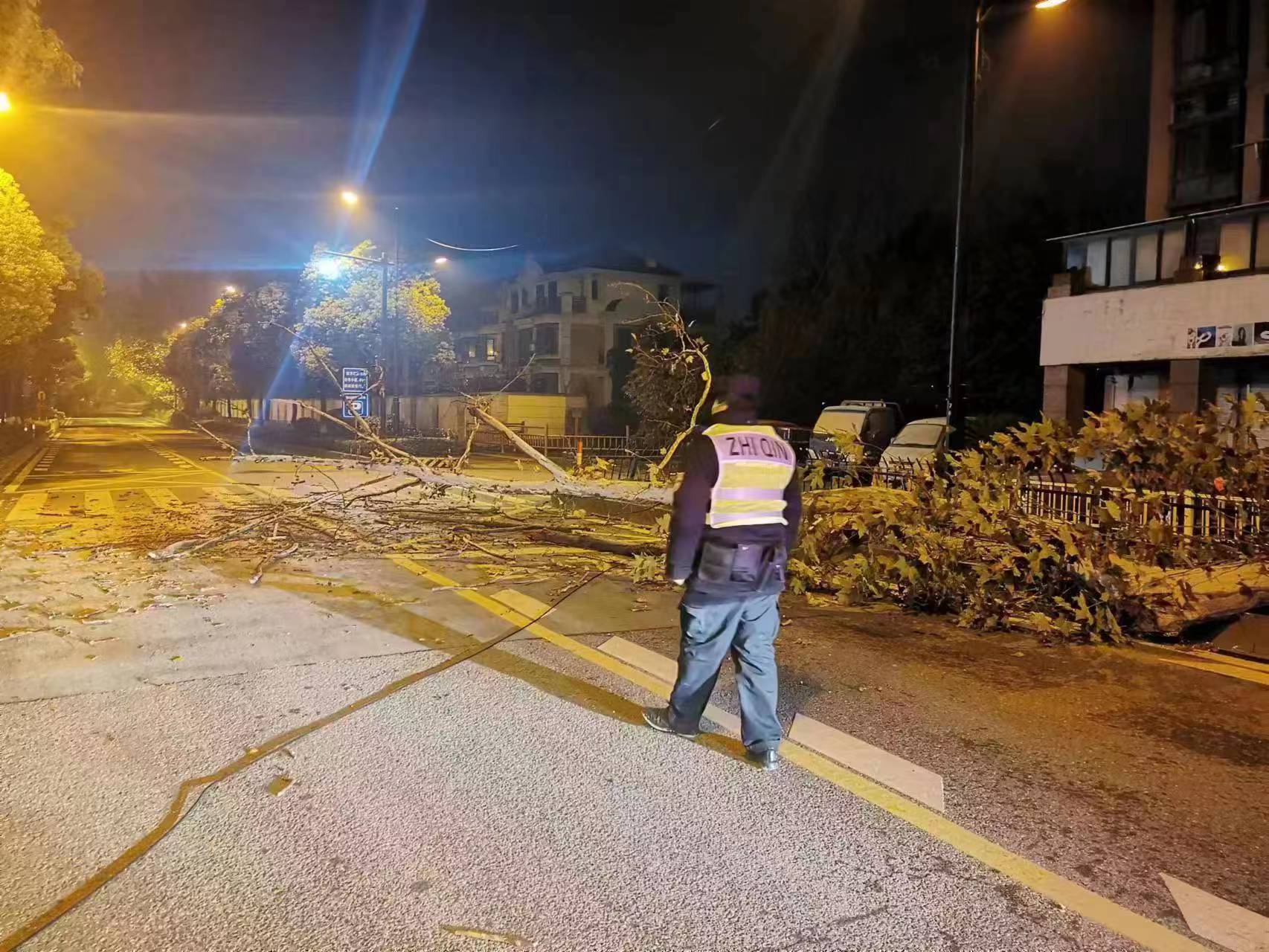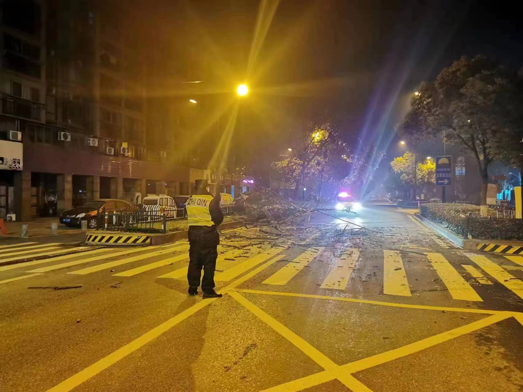 兩人迅疾來到現(xiàn)場,一棵大樹折斷后橫在馬路上,凌亂的枝干正好將馬路攔腰截?cái)啵囕v通行嚴(yán)重受阻。由于時(shí)值凌晨,附近商戶沒有開門,兩人也無排障工具,于是就在現(xiàn)場設(shè)立了警戒線,向指揮中心報(bào)告情況并呼叫增援。