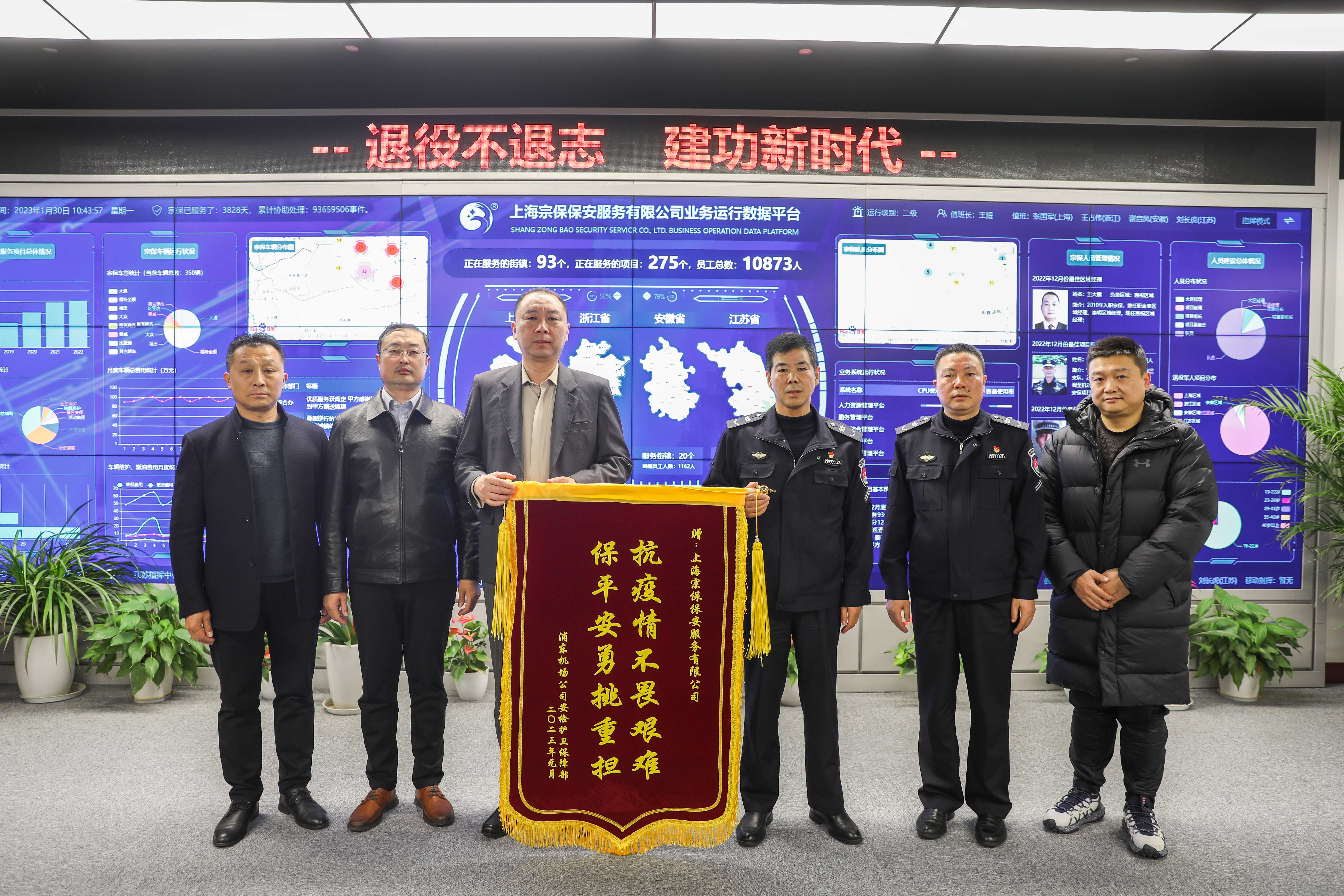 1月30日,上海國際機(jī)場股份有限公司浦東國際機(jī)場安檢護(hù)衛(wèi)保障部黨委書記鮑飛榮、紀(jì)委書記陳長波一行將繡有“抗疫情不畏艱難 保平安勇挑重?fù)?dān)”的錦旗和感謝信送到宗保公司,感謝公司對浦東機(jī)場疫情防控工作的大力支持。