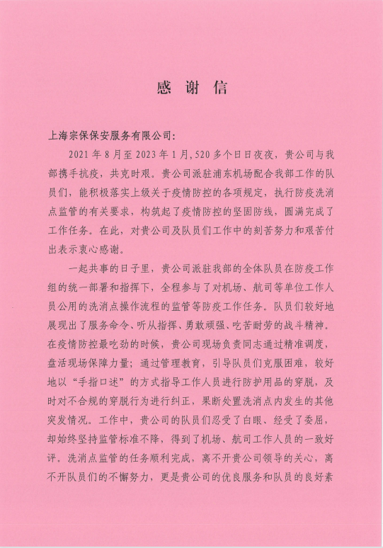 隨著疫情防控政策的優(yōu)化調(diào)整,公司駐浦東國際機(jī)場疫情防控項目完成了其使命,但公司將銘記甲方的褒獎和激勵,繼續(xù)保持機(jī)場疫情防控中所展現(xiàn)出來的擔(dān)當(dāng)情懷、奉獻(xiàn)精神和工作作風(fēng),為持續(xù)助推城市精細(xì)化管理,傳遞城市溫情,提升城市溫度,貢獻(xiàn)宗保力量。