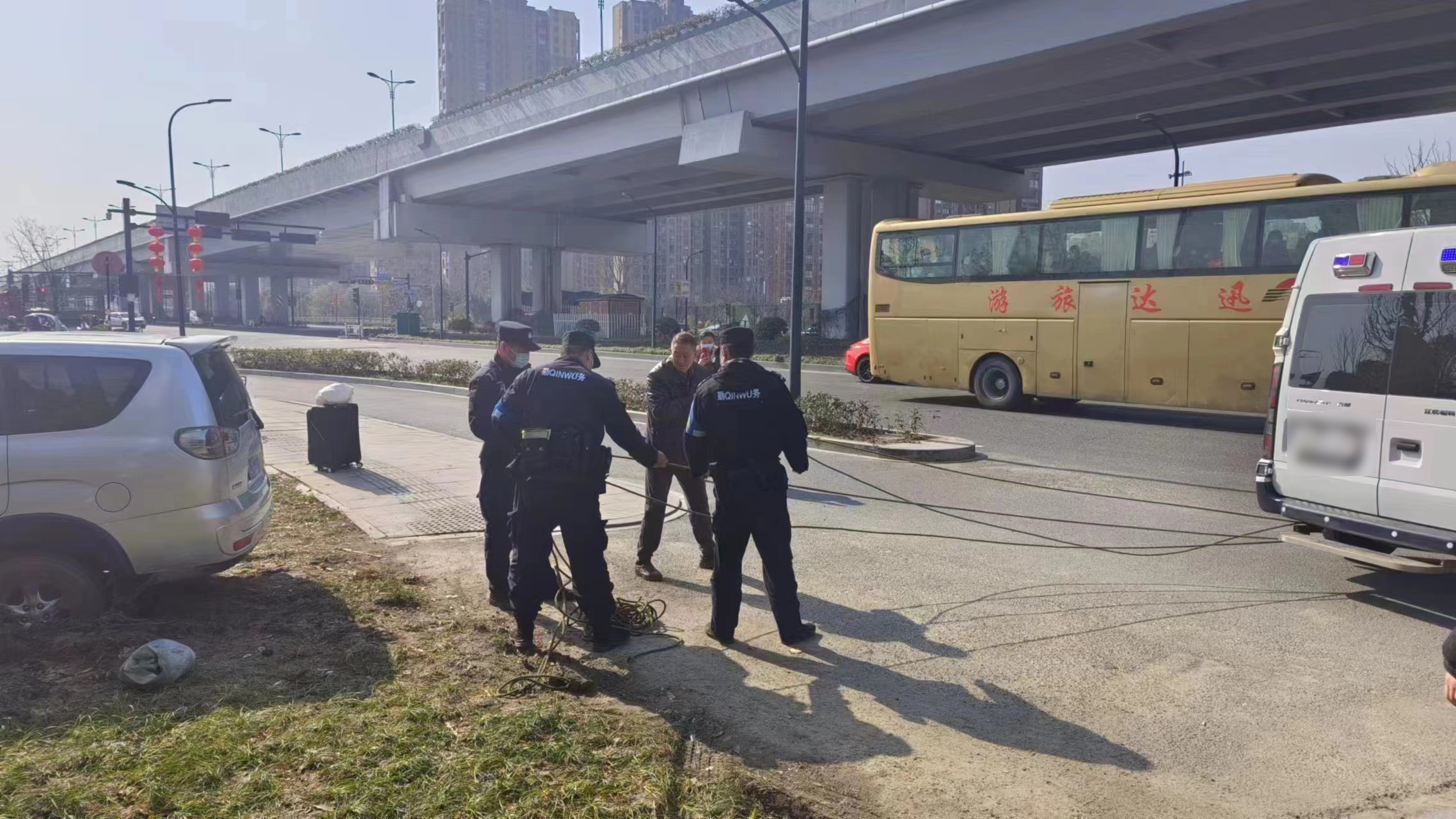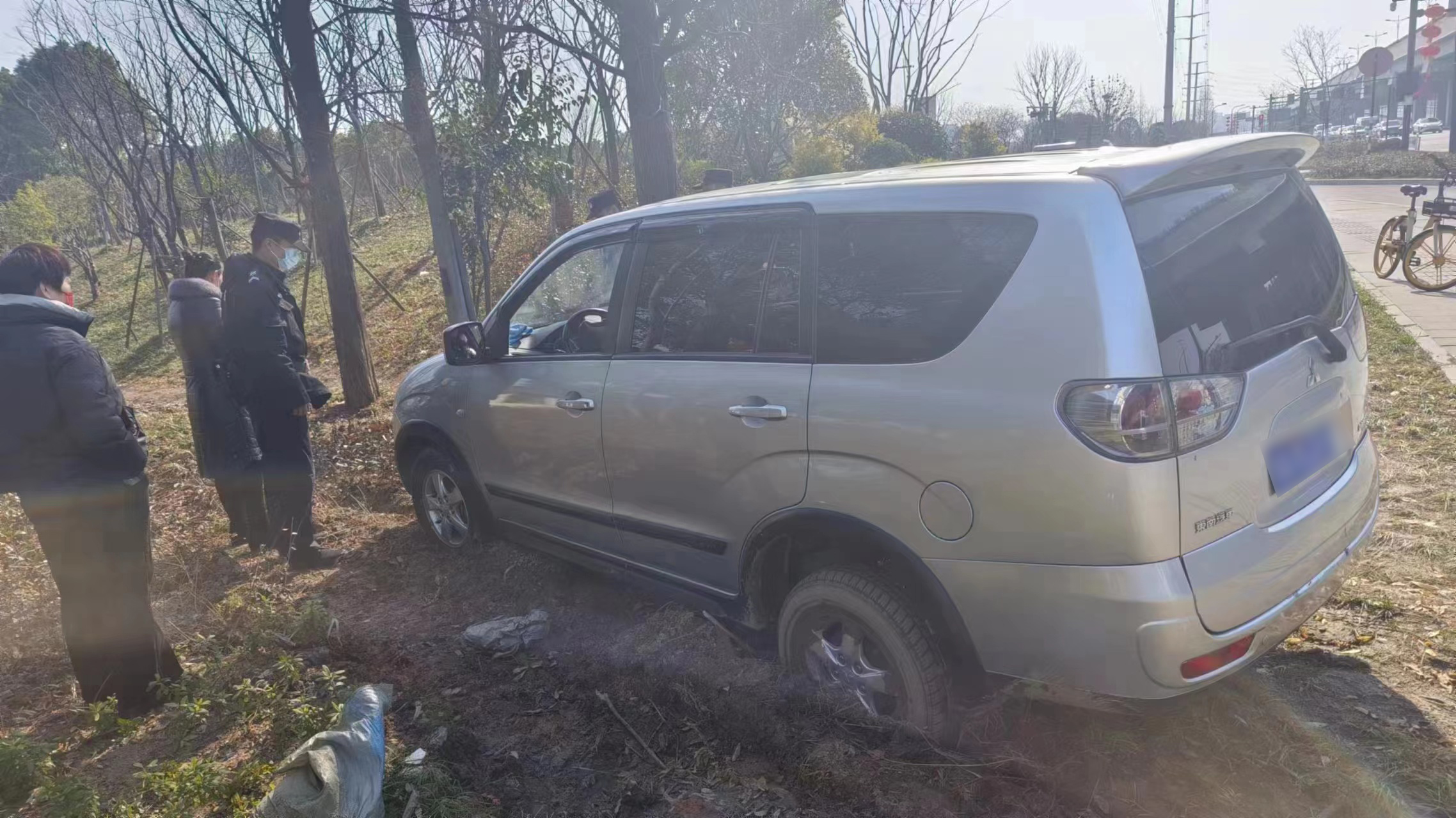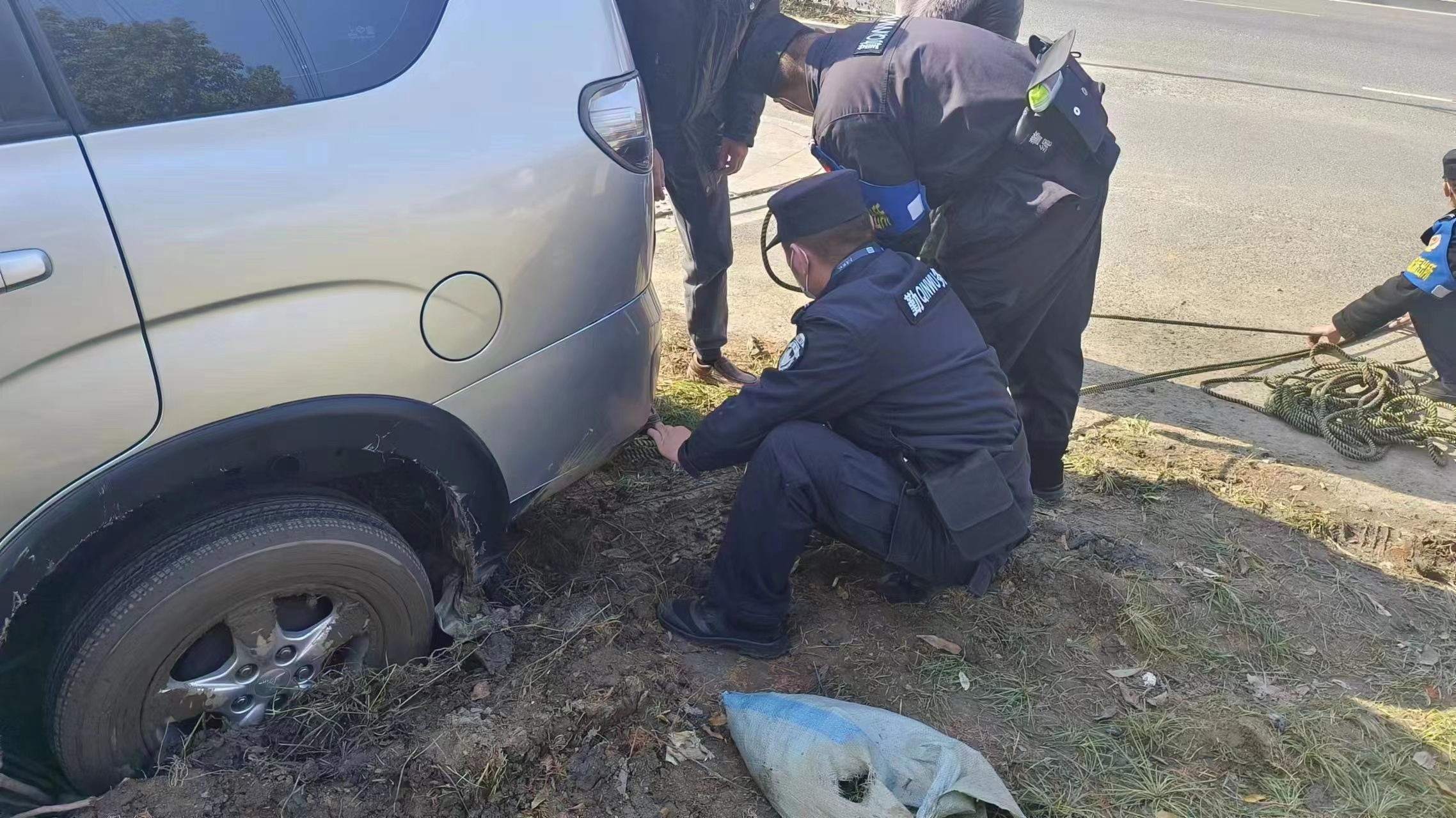 當(dāng)日11:02,公司員工李瑞龍、劉振疆和新城派出所輔警王丹杰、周天誠(chéng)巡邏至康橋路與通益路交叉口時(shí),發(fā)現(xiàn)一輛銀色商務(wù)轎車(chē)陷到了泥地之中,車(chē)后雖有人助推,但仍然無(wú)法行走。幾人見(jiàn)狀趕緊上前詢(xún)問(wèn),原來(lái)車(chē)主于師傅送朋友到良渚南莊兜車(chē)站乘車(chē)。因路況不熟,不小心將車(chē)開(kāi)到了泥濘的綠化帶中。