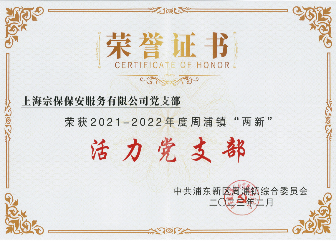 2月15日,浦東新區(qū)周浦鎮(zhèn)黨委對一批優(yōu)秀強國學習達人、優(yōu)秀黨務(wù)能手和先進基層黨組織進行表彰。上海宗保保安服務(wù)有限公司黨支部榮獲2021-2022年度周浦鎮(zhèn)“兩新”活力黨支部榮譽稱號。
