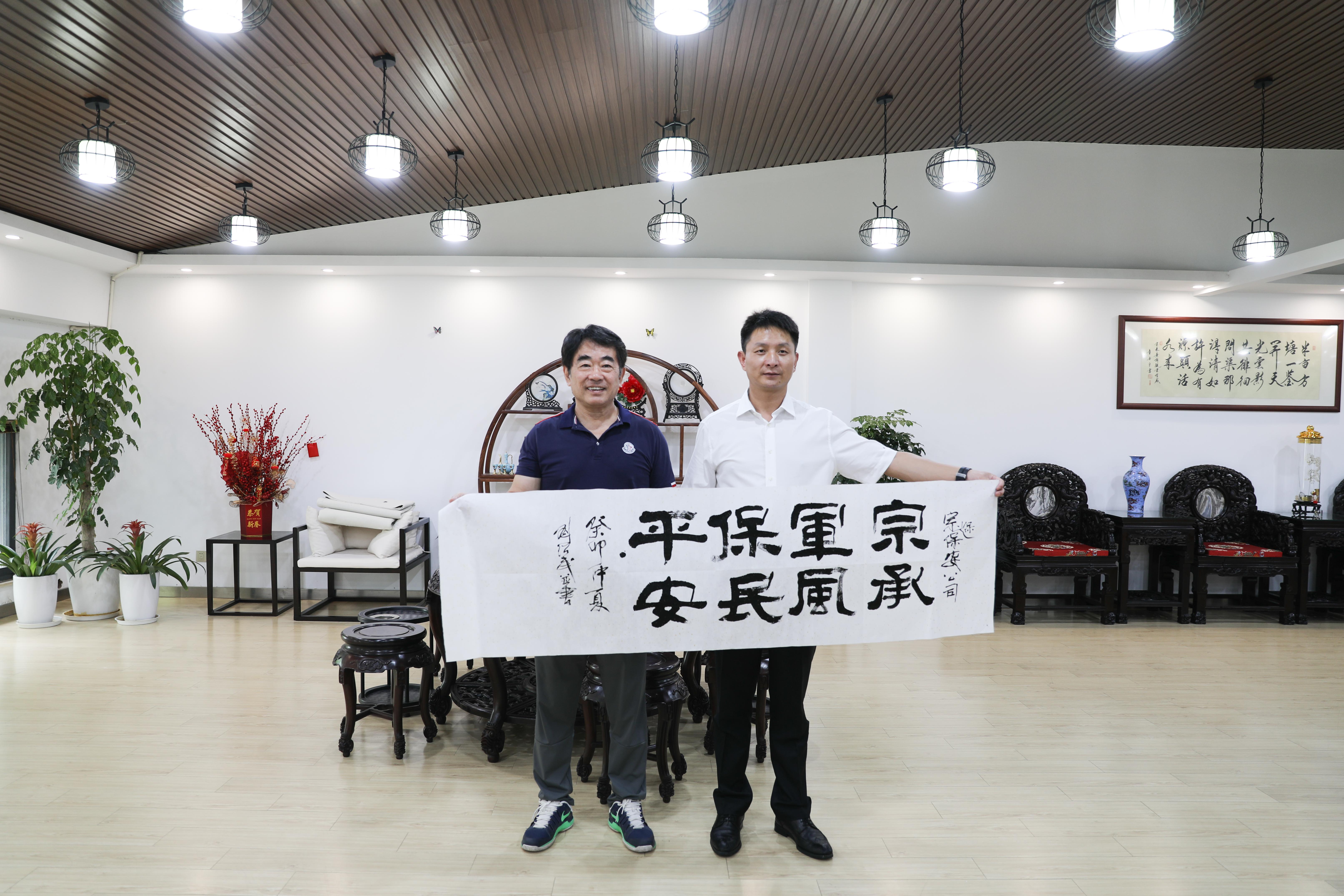 劉紹武第一副會長一行首先來到公司運營指揮中心,觀看了《擦亮軍人底色 彰顯使命擔(dān)當(dāng)》視頻短片,接著又察看了公司榮譽墻、退役軍人員工照片墻和黨建文化墻,參觀了公司基地、員工宿舍和培訓(xùn)大禮堂。隨后一行人又來到公司書畫室,劉紹武第一副會長應(yīng)邀為公司即興題寫了“宗承軍風(fēng)  保民平安”的書法。
