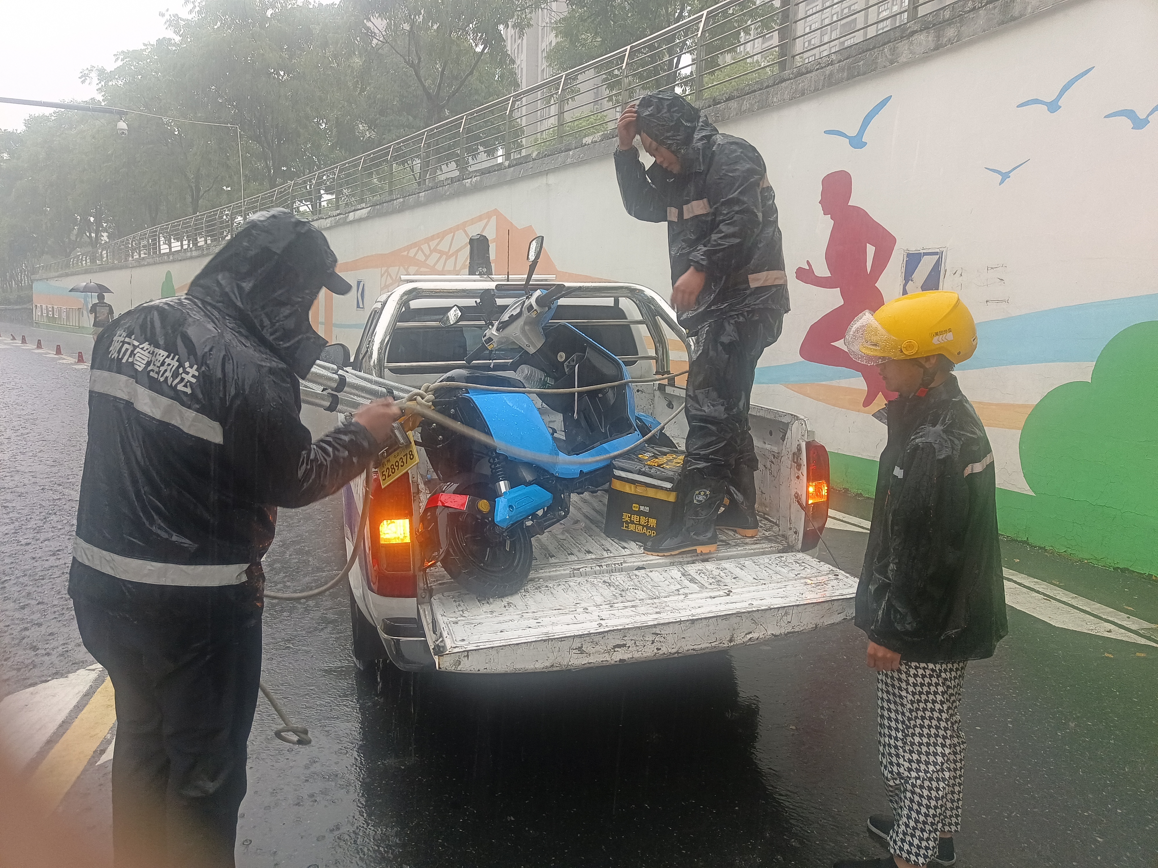 當(dāng)日15:54,公司員工吳寶和李忠英在臨丁路體育公園涵洞邊巡查涵洞內(nèi)積水情況時(shí),發(fā)現(xiàn)一外賣小哥推著電瓶車艱難地在暴雨中行走,兩人見(jiàn)狀便主動(dòng)上前詢問(wèn)。