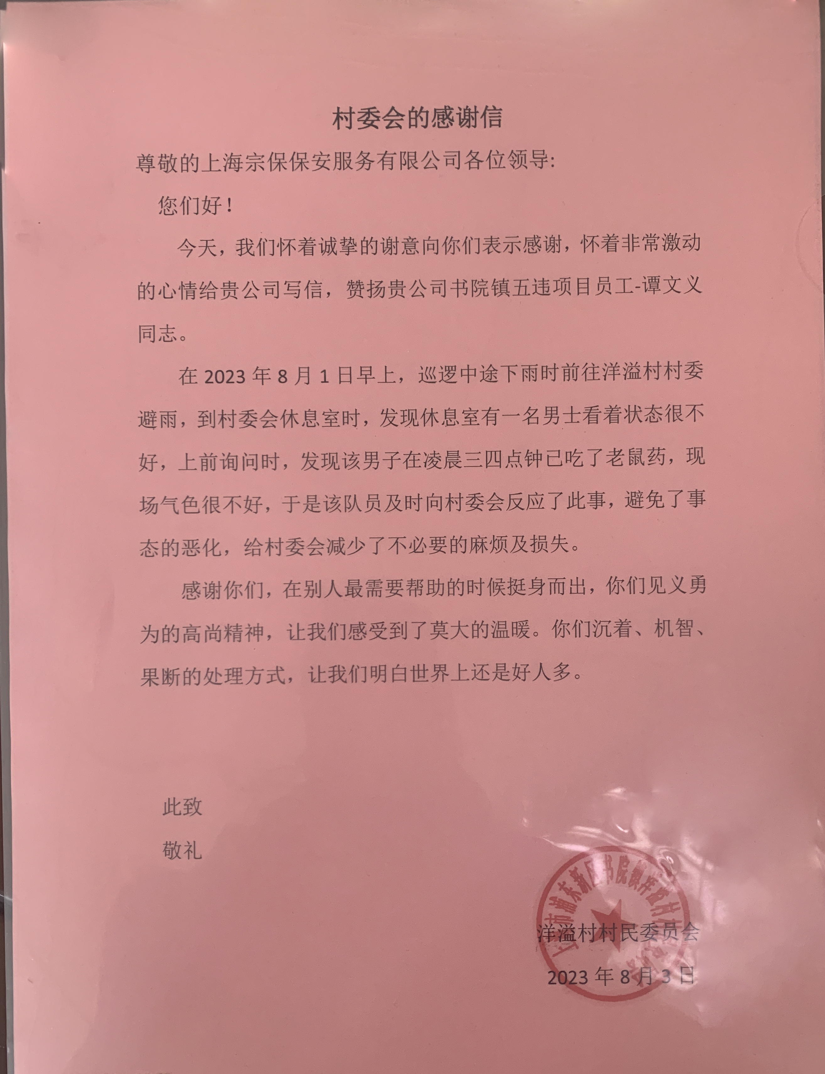 8月3日,宗保公司駐浦東臨港書(shū)院項(xiàng)目收到浦東新區(qū)書(shū)院鎮(zhèn)洋溢村村委會(huì)繡有“熱心為民 忠于職守”的錦旗和一封感謝信,感謝公司員工譚文義8月1日早上在村委會(huì)休息室避雨時(shí),敏銳察覺(jué)一男子狀態(tài)不佳,詢問(wèn)得知其吃了老鼠藥欲尋短見(jiàn)后,立即告知村委會(huì),120及時(shí)趕到挽救男子生命的善舉。