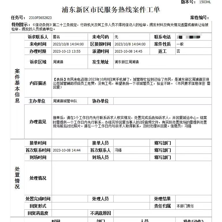 10月8日13:30,宗保公司駐浦東新區(qū)周浦市容項目員工賈勝輝在周秀路巡查時,撿到一部華為手機。因手機設(shè)有鎖屏密碼,一時無法聯(lián)系到失主,賈勝輝報告班組長后便在原地等待失主。大約過了10多分鐘,一男子打來電話自稱是失主,賈勝輝了解情況后,就與他約好在周浦鎮(zhèn)城管執(zhí)法中隊碰面。很快,男子趕到約定地點,成功地解開了鎖屏密碼。賈勝輝確認男子是失主后,將手機交還給了他。男子拿著手機連連向賈勝輝道謝,并特意撥打了12345上海市民熱線,贊揚宗保公司駐周浦市容項目員工賈勝輝拾金不昧的行為。