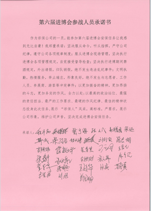 接著,公司員工栗閃召代表全體參與進(jìn)博安保員工表決心。隨后,全體參與進(jìn)博安保的員工舉起右手,在帶隊(duì)骨干程澤昆的領(lǐng)誓下宣誓:我志愿參加第六屆進(jìn)博會(huì),服從命令,聽從指揮,嚴(yán)守公司紀(jì)律,遵守公司各項(xiàng)規(guī)章制度;服從進(jìn)博會(huì)現(xiàn)場管理......,展示 “宗保人”風(fēng)采,高標(biāo)準(zhǔn),嚴(yán)要求,展示公司形象,維護(hù)公司聲譽(yù),堅(jiān)決完成進(jìn)博會(huì)安保任務(wù)。